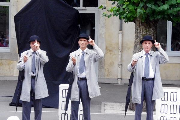 Trois clones de Gentlemen, à l’allure british plutôt que belge, rendent hommage au surréalisme dans un unisson stoïque. Parapluie au bras, chapeau-melon sur la tête, le visage figé comme pour figurer un masque neutre, ils entendent bien se soulever contre la gravité en rappelant par leurs gestes qu'ils pourraient bien être sortis de Golconda, ce tableau de Magritte où des hommes aussi uniformes qu'eux-mêmes peuplent le ciel. Ces trois têtes à pipes n'en sont qu'un échantillon qui a échoué parmi nous par hasard. Et si, par hasard encore, c’était un seul homme fêlé en trois, il reste bien soudé dans sa schizophrénie.