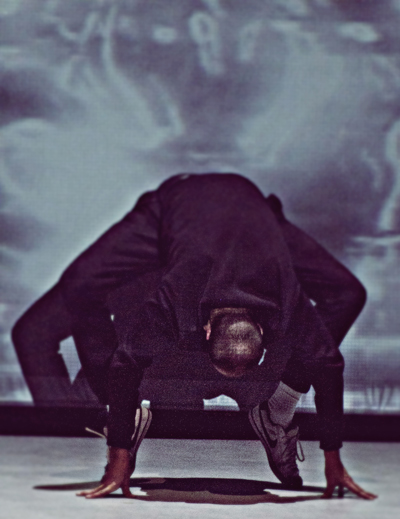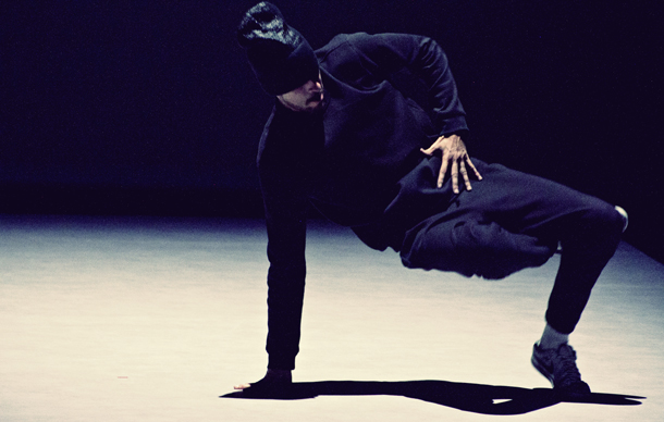 Ce corps vacillant au ralenti, mis sous double tension - à la fois par l'état vécu et par son extrémisation chorégraphique - renvoie aux recherches de Merce Cunningham sur les limites de la stabilité et de l'équilibre. Etant donné que le hip hop, et la breakdance en particulier, fonctionne grâce à la vitesse, le ralenti est une véritable gageure qui transpose vers le hip hop le précepte cunninghamien : « Un mouvement devient intéressant à partir du moment où il a l'air maladroit ». Le personnage incarné par Bernier déplace son inadaptation au monde sur le terrain de la lenteur, état aussi extérieur au monde actuel qu'au hip hop. Voilà à quoi ressemble Monsieur K, projeté vers l'époque des applications tous azimuths.