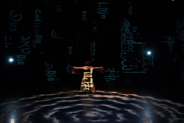 Précisément, c'est alors le nom de Dieu, volant, universel dans une grande variété de langues, rebelle à toute assignation identitaire excluante, qui grêle et hâchure tout l'espace ; le détrempe. Izeddiou s'y aventure alors, fragile après s'être intégralement dénudé, d'une nudité pudique, mais d'un corps arabe, combien courageux dans cet acte, comme déterminé à percer tout interstice possible dans l'oppressante tournure tournante que prennent aujourd'hui les questions de référence religieuse, identitaire, culturelle.