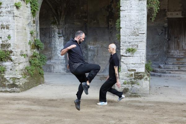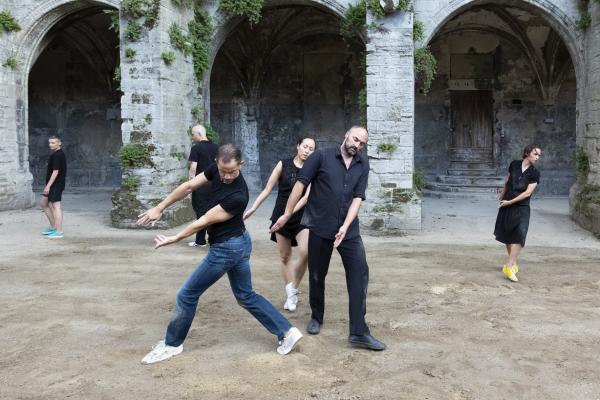 À cour, les musiciens. Trois dont une chanteuse qui s'assoie à plusieurs reprises sur le banc au pied de l'énorme platane. À jardin, les danseurs qui, à partir de l'engagement du mouvement vont lancer la dynamique gestuelle, comme une équation qui trouve sa résolution, avant de reprendre, inlassablement. Ils en viennent à faire masse au sol, mais seulement comme un état plus éloigné de la danse et dont la danse va procéder. L'un bouge et ce germe suffit à faire éclore le mouvement de l'ensemble avec une manière d'évidence. N'y pas voir trop d'intentions dramatiques sur le thème de la peste et de la Renaissance en lien avec la musique. Dans le fond, musique et danse n'entretiennent pas tant de relations et les huit danseurs vêtus de noir et de tennis, alternent courses, temps comme suspendus, entremêlements d'une inventivité permanente. Cela suffit. Cela ressemble parfois à une joute de cadors, voire à un défi lancé. L'intimité d'avec les interprètes permet d'entendre le râpeux des chaussures au sol, le souffle de l'effort, jusqu'au choc des chairs. L'intimité de la danse en tant que telle et ce flux induit le passage du temps. La lune glisse un croissant entre les feuilles des arbres, quelques corneilles se chamaillent, un grand bruit derrière et le vent qui se lève. La nuit qui descend et qui gomme les traits et les identités, ne laissant, quand entre chien et loup l'un se dévêt entièrement et s'allonge sur la terre, que l'opalescence anonyme du corps.