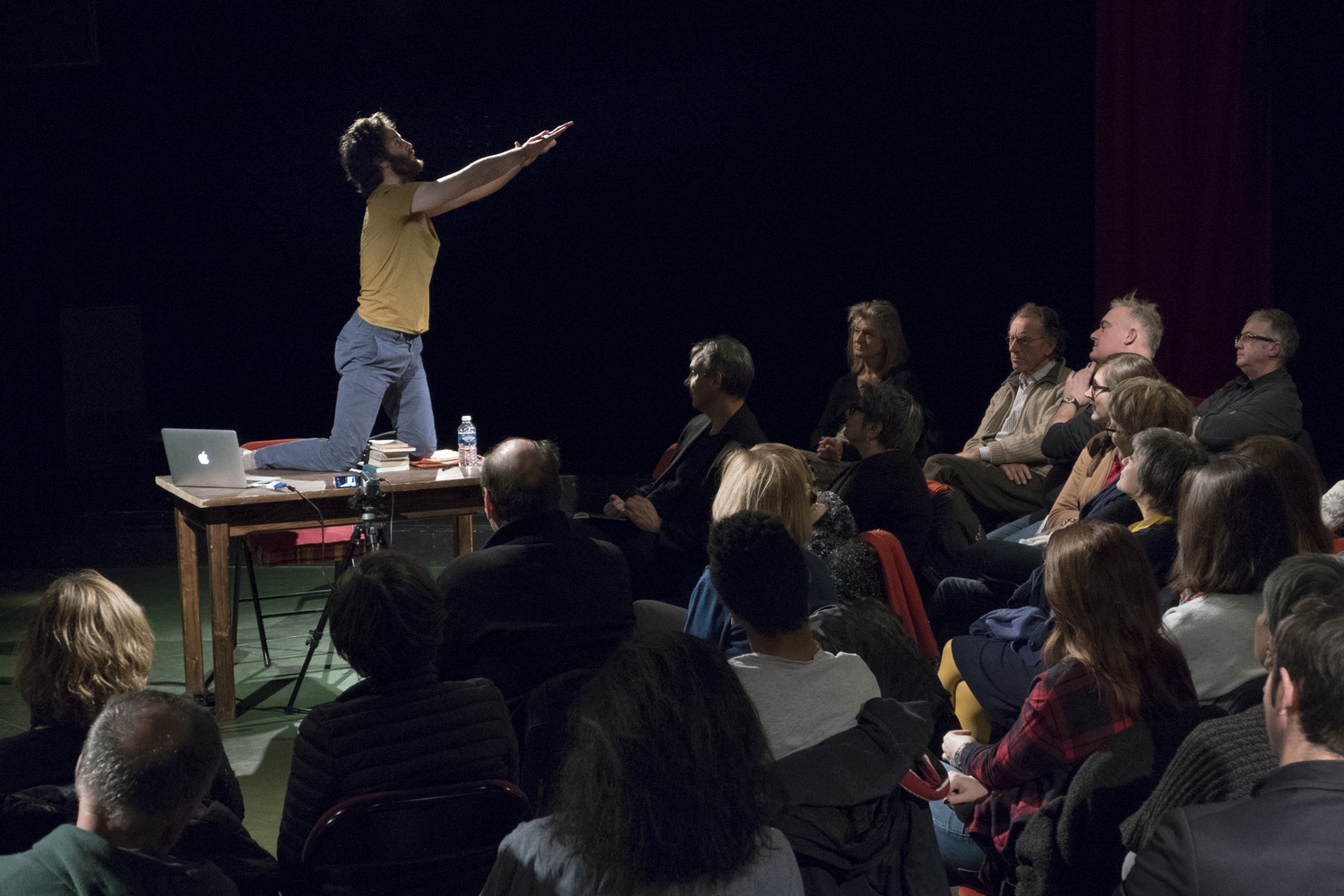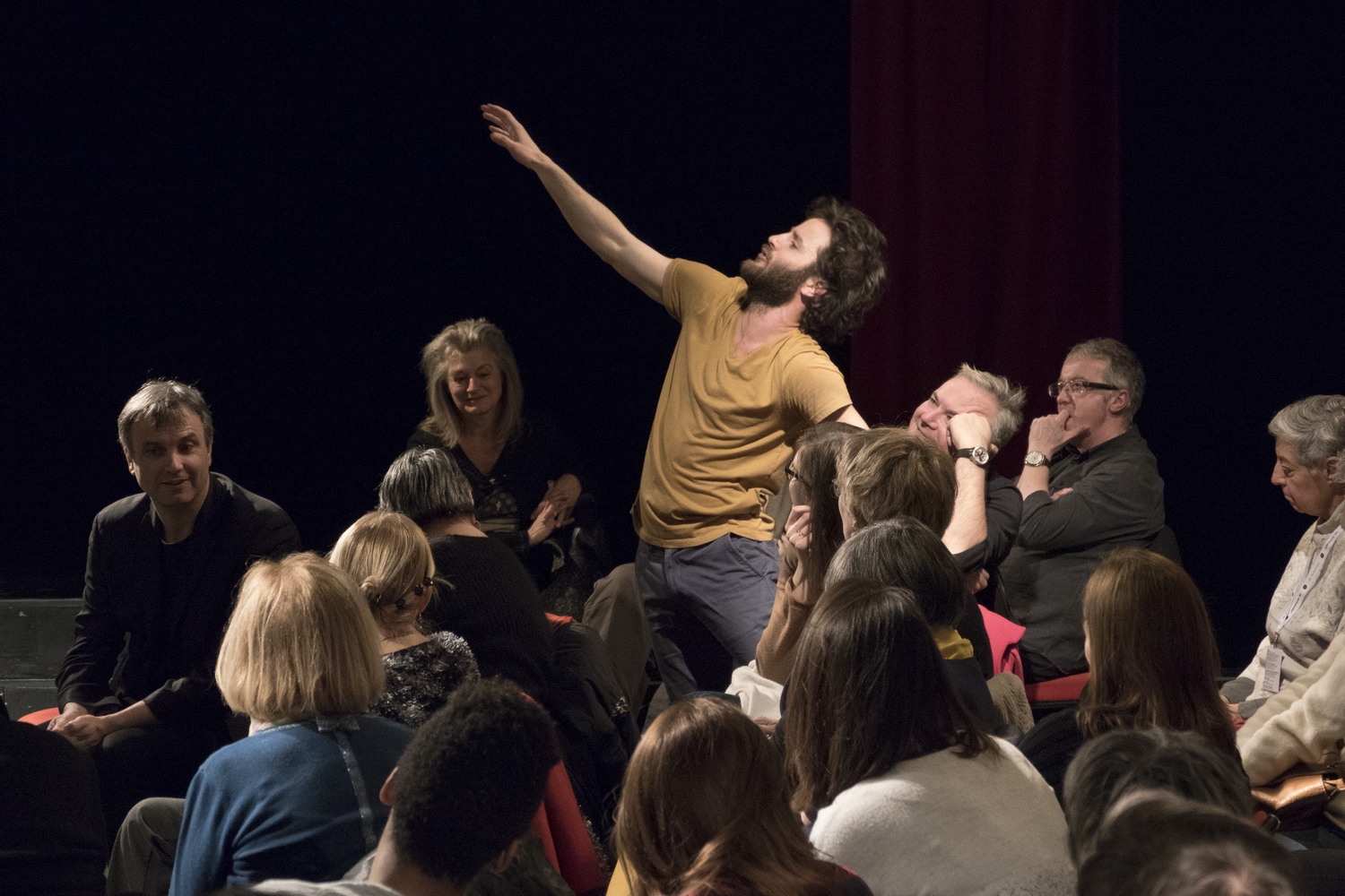 Simon Tanguy s’y emploie à laisser libre cours à ses pensées, ses fantasmes, ses peurs, ses envies, ses observations et à quelques gestes qui confirment son lien avec la danse. Il investit là sa version personnelle d’une performance créée en 2010 par la chorégraphe new yorkaise Jeanine Durning.