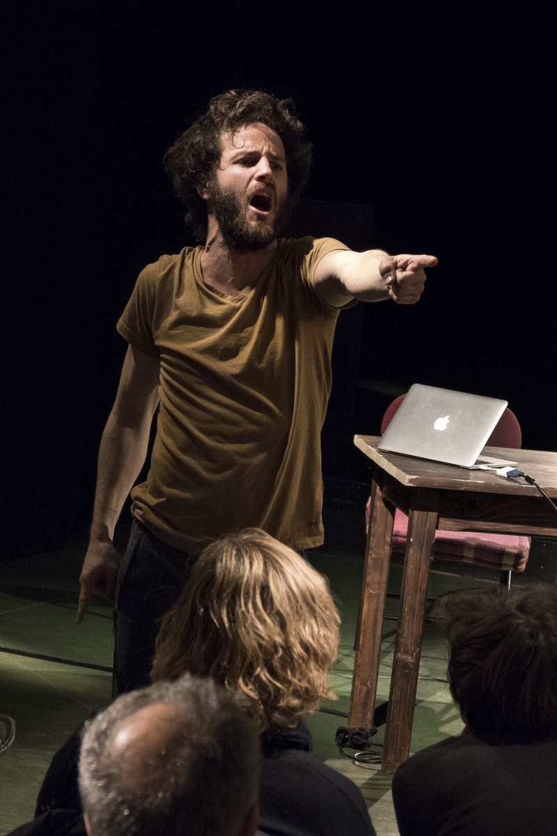 Derrière son bureau, où s’empilent quelques livres, à côté d’un ordinateur et d’une caméra – comme chez Jeanine Durning précisément – Tanguy se lance même dans un grand écart, métaphore de son parcours artistique entre clown, danse et judo, ici résumé dans un solo de comédien-improvisateur. Son petit public professionnel, il l’a ici invité sur le plateau même, sur des chaises installées à distance de sécurité virale, portant les masques qui sont de circonstance. Et Tanguy ose. Parler de tout. Faire rire. Se dévoiler dans ses fantasmes, ses peurs, ses espoirs, ses frustrations.