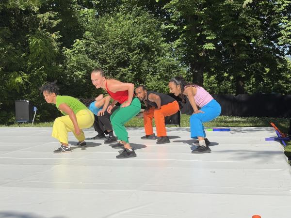 Avec, au contraire, l’assez longue performance Relief, la compagnie En Lacets (Maud Marquet, Lysandre Korelis, Marie Sinnaeve et Angélique Spiliopoulos) nous a permis de changer de terrain de jeu, de passer de la scène au théâtre de verdure, du plancher recouvert de PVC blanc aveuglant les danseurs au jardin étagé, accidenté, domestiqué. Le trio de service a meublé l’immensité à disposition. Des pieds émergent du sol comme des plantes aux couleurs vives des costumes designés par Cécile Rivet. Sur la musique de Maxime Boubay, le trio arpente le territoire, de jardin à cour, si l’on peut dire. Il forme des sculptures vivantes, qui exigent un savoir-faire en matière de contorsion. Est élargi le champ chorégraphique à la routine cabaretière, au numéro circassien et même ou surtout au land art.