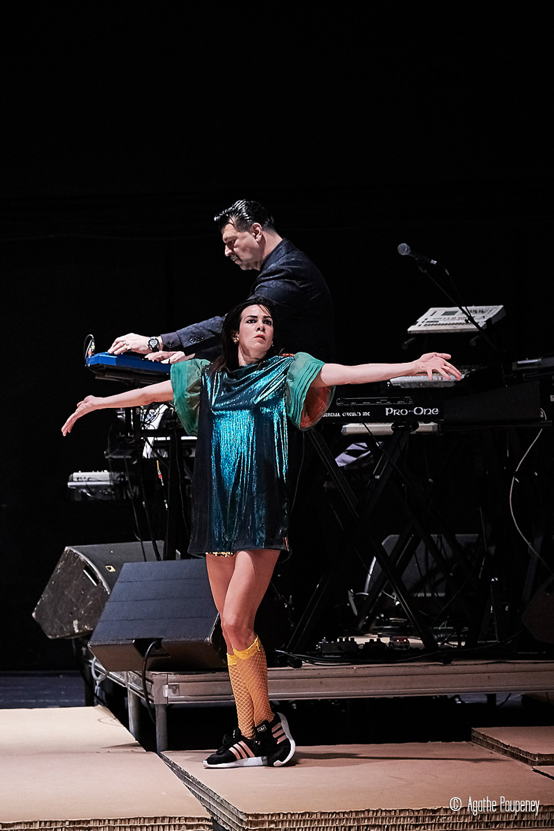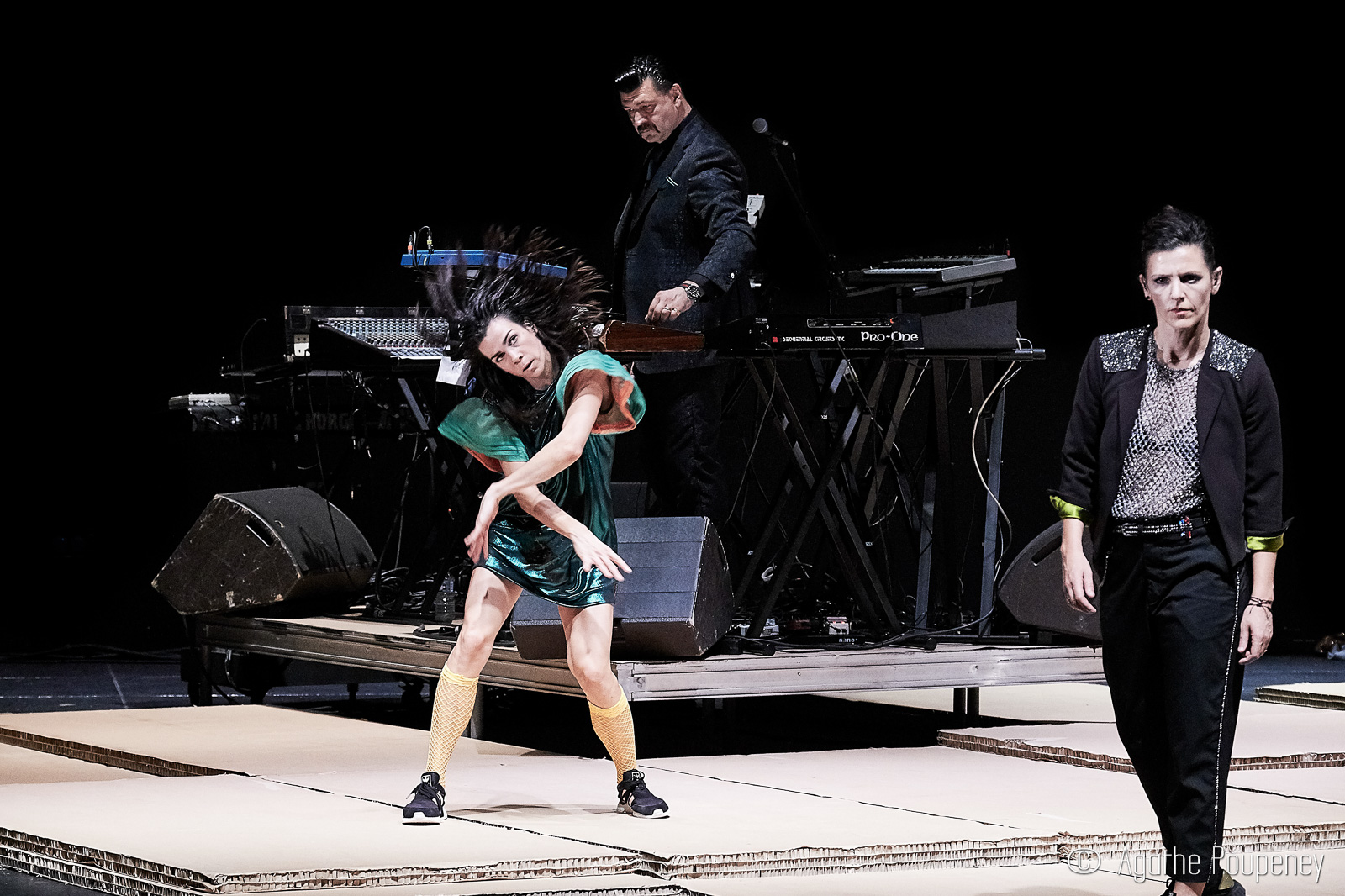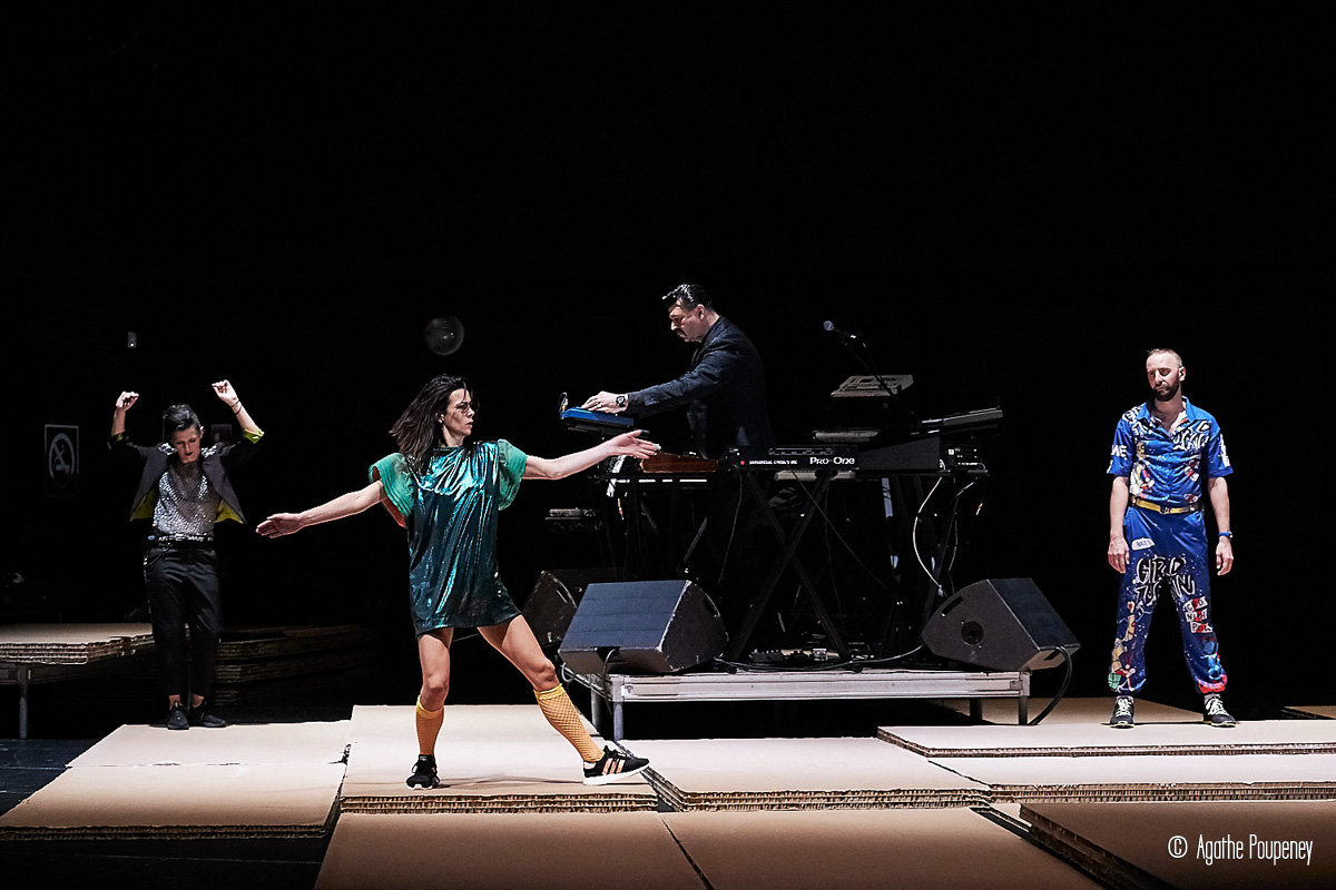 Chacun des danseurs, isolés sur des plaques de carton, vit son propre trip, son propre rythme, seule la rage est commune. Sortes de stars déchues, en robe à paillettes, en short panthère et dentelle noire, en veste à sequins sans oublier une combinaison bleue à mangas, elles se déchaînent tandis que vibrent les synthés d’antan d’Arnaud Rebotini, saturant l’espace de leur amplitude sonore. La gestuelle, à l’image de ces vrombissements qui déraillent parfois dans les aigus, transmute le corps unifié et certain en un corps désarticulé et improbable, rompant définitivement avec l’ordre tacite qui institue le danseur et qui tend à rendre visible la maîtrise de ce dernier sur son propre geste. Tout est pulvérisé par ces discours incompréhensibles et le flux de cette musique qui retourne les sens et les chairs.