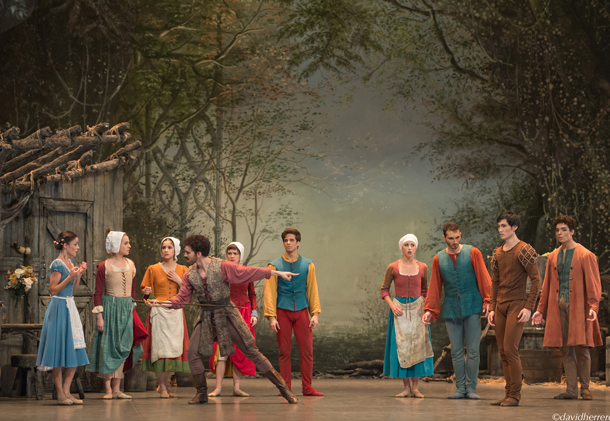 Tels les cartons de textes et de répliques qui entrecoupaient les films muets, elle rend compréhensible en quelques moments clés le drame qui se noue. Du début à la fin de l’acte les réjouissances paysannes forment une toile de fond colorée à l’action et aux variations virtuoses, exténuantes, de Giselle. Les accessoires (tonneaux, grappes de raisin, pampres) entrent dans les évolutions des vignerons, dont les mouvements ancrés dans le sol, genoux pliés, pieds flexes, fesses légèrement projetées vers l’arrière, s’apparentent à un style chorégraphique plus proche d’un Mats Ek qu’aux danses de caractères dont s’inspirent le plus souvent les versions consacrées de l’œuvre. Un duo d’ivrognes apporte, dans une variation truffée de difficultés techniques, une touche humoristique à cet acte enlevé, sans temps mort, dans lequel péripéties et sentiments se succèdent à un rythme rapide comme se croisent dans un bal de village, amour et flirt, regards jaloux et gestes d’amitié.