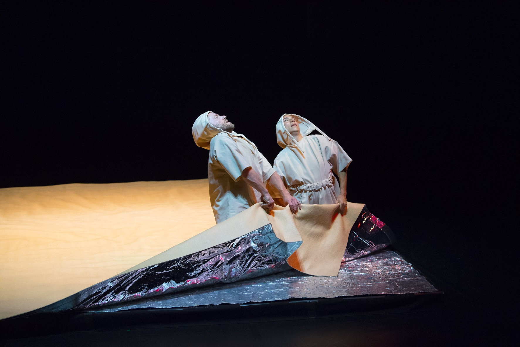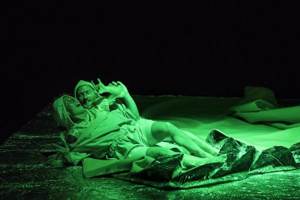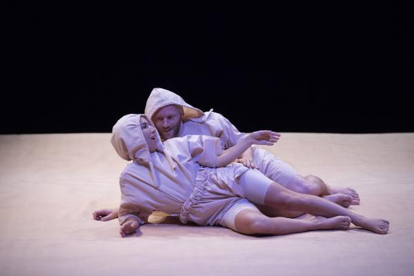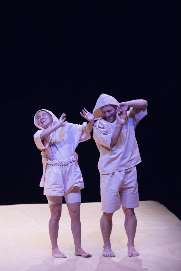 Tout commence sous les meilleures auspices pour les protagonistes. Une femme, un homme, tout de blanc vêtus, visiblement épris l’un de l’autre - et c’est tout naturel puisque Demestri et Lefeuvre sont un couple à la ville - se promènent dans un paysage imaginaire. Se regardent, conversent, explorent leur coin de paradis. Et tirent là sur une corde tout sauf futuriste. Les costumes rappellent le lin blanc du 17e siècle, comme pour des tenues d’artisan, mais sont en même temps inspirés du Bauhaus. Mais l’aspect historisant est une ruse. Sur les costumes, Nicolas Olivier envoie une coloration mystérieuse et distordue, tel un camouflage, et pour ce faire, il emploie des moyens qui appartiennent à notre temps, époque ainsi éclairée dans toute sa vertigineuse confusion.
