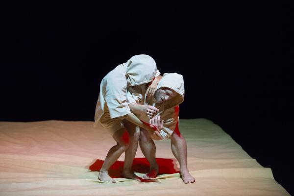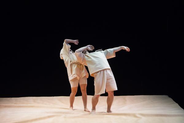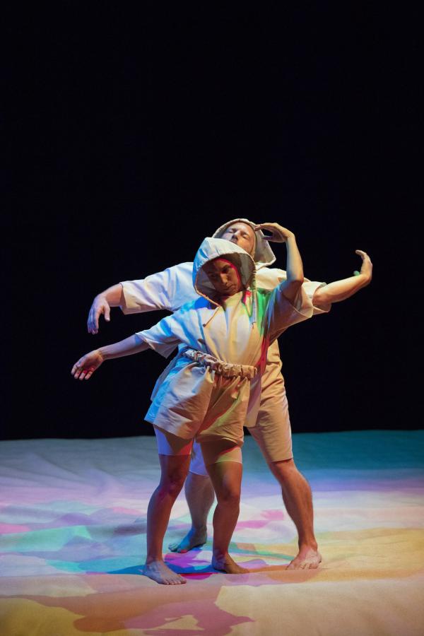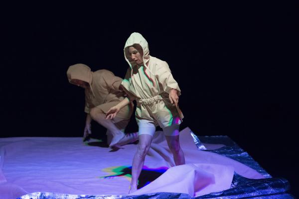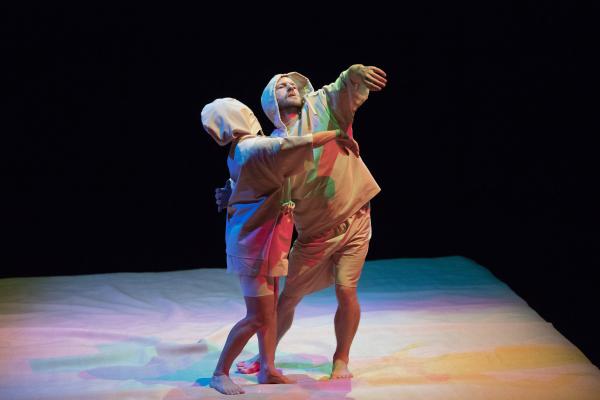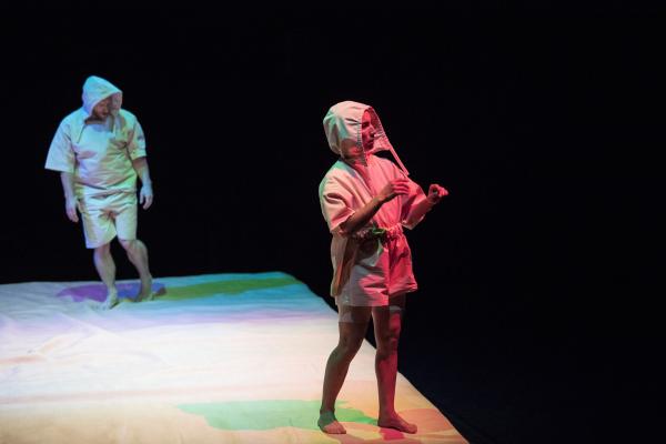 Dans sa coloration irréelle, ce qui est projeté sur les habits ressemble fort à des parties de corps des deux protagonistes qui, dans la perception du spectateur finissent par ne plus former qu’un seul corps. Tout est fait pour perturber la perception. Et même au sol, leurs ombres se mettent à vaciller, à sauter, à vriller, et changent parfois de couleur. A l’instar des gestes, les ombres font glitch : les corps se figent, alors que leurs reflets se drapent de couleurs et exécutent un ballet mécanique aux allures stroboscopiques.