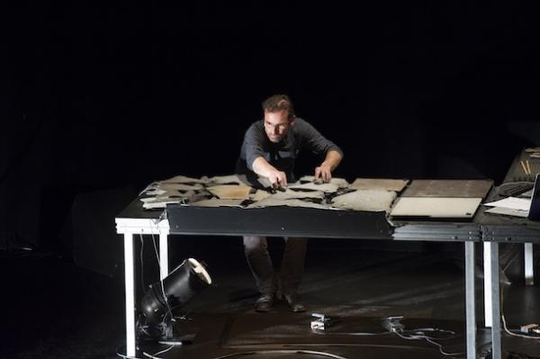 La scène est partagée en deux : d’un côté les danseuses, Margot Dorléans, Carole Garriga Deborah Lary et Véronique Weil, de l’autre les musiciens : le compositeur Kasper T. Toeplitz et Philippe Foch. C’est la musique, produite par le frottement de lauzes – cette pierre grise utilisée pour les toitures, qui d’abord, retient l’attention. Minérale mais chantante, mystérieuse et prenante, naturelle et futuriste.