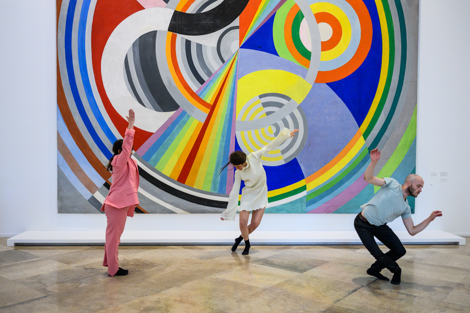 Il convient de signaler que Liam Warren ne ménage pas ses efforts, glissant jusqu’à, quasiment, chuter sur le marbre qui fait office de parquet. A l’instar de Charles III visitant une mosquée, ses chaussettes sont trouées par l’usure ; elles sont visibles, incarnat comme celles de ses consœurs et des cardinaux – une teinte dont raffolaient Balladur et Babilée. Anna Carraud fait parade de postures et de mimiques enfantines et Margaux Amoros passe du calme à l’agitation, de l’impavidité à l’emportement, de l’immuabilité à l’affolement. Les stations du chemin de croix conduisent le trio (et ses suiveurs) de Soulages à Buren en passant par Delaunay, de l’abstraction au minimalisme, de la valeur la plus sombre (dans tous les sens du terme) à la couleur la plus saturée – on pense à la variation devant le tableau de Dewasne. Le public, venu en nombre, a paru sensible à l’interprétation d’une expression par l’autre. Il faut dire que la danse a souvent fait place à la pantomime, voire au théâtre expressionniste. Cette sensation est renforcée par la contiguïté du public avec des danseurs censés être distants, sinon distanciés, en tout cas « ailleurs », dans leur monde. Ceci dit, les spectateurs ont joué le jeu, une heure et demie durant.