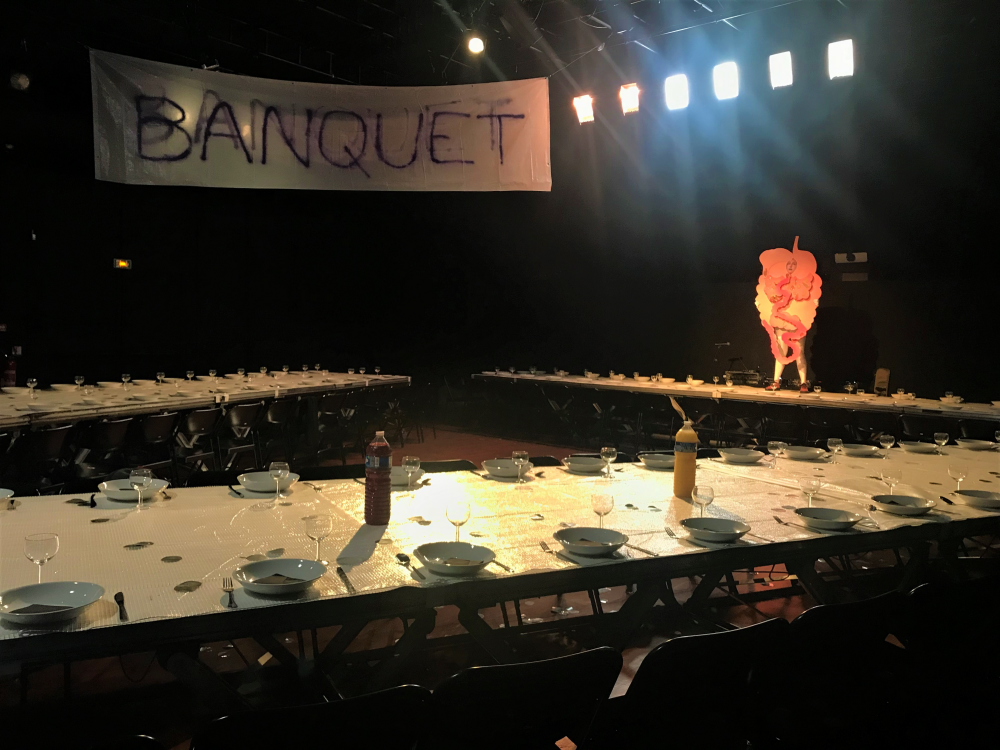 Pendant ce temps, au banquet, le public arrive pour consommer nourriture, pensées et images. Mais on sent bien qu’ici il n’y a pas de spectateurs, qu’on a un rôle à jouer, que chaque humain y participe en même temps d’une scénographie vivante. Il n’y a pas de séparation, le spectacle est dans la salle et sur les tables, célébrant sur un mode très féminin le trou noir dans ventre, porteur de poésie digestive, savante et spirituelle. Les estomacs caressés de l’intérieur par le mafé, le public se réjouit de l’arrivée des femmes qui ont préparé le repas et nous invitent maintenant à danser. Ce sont Les Mères en Place, une association du 19e arrondissement qui lutte pour l’alphabétisation des jeunes et plus encore. Après le repas, elles apportent chaleur musicale et humaine...