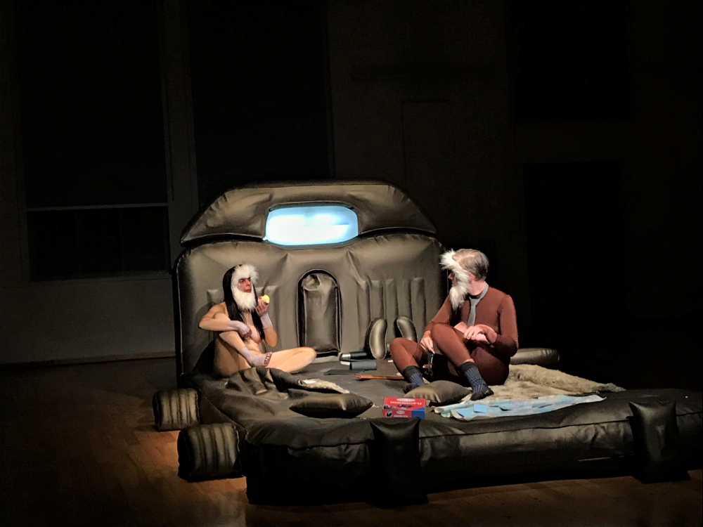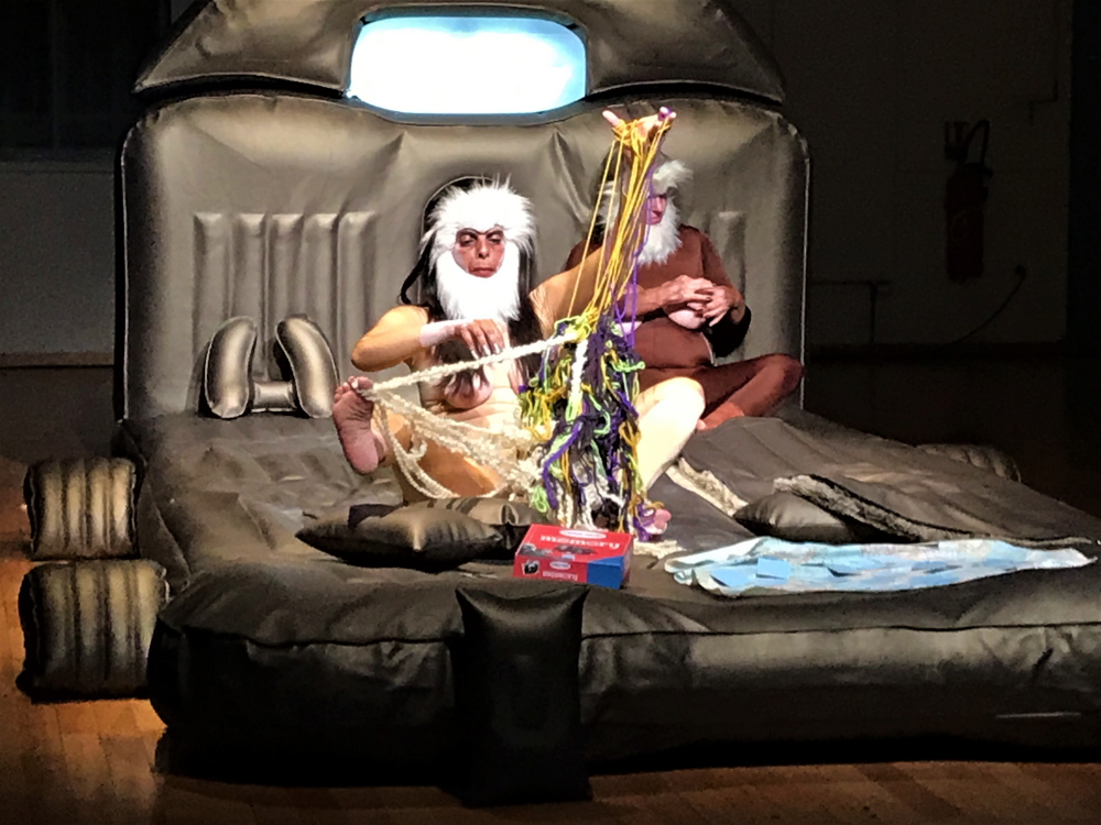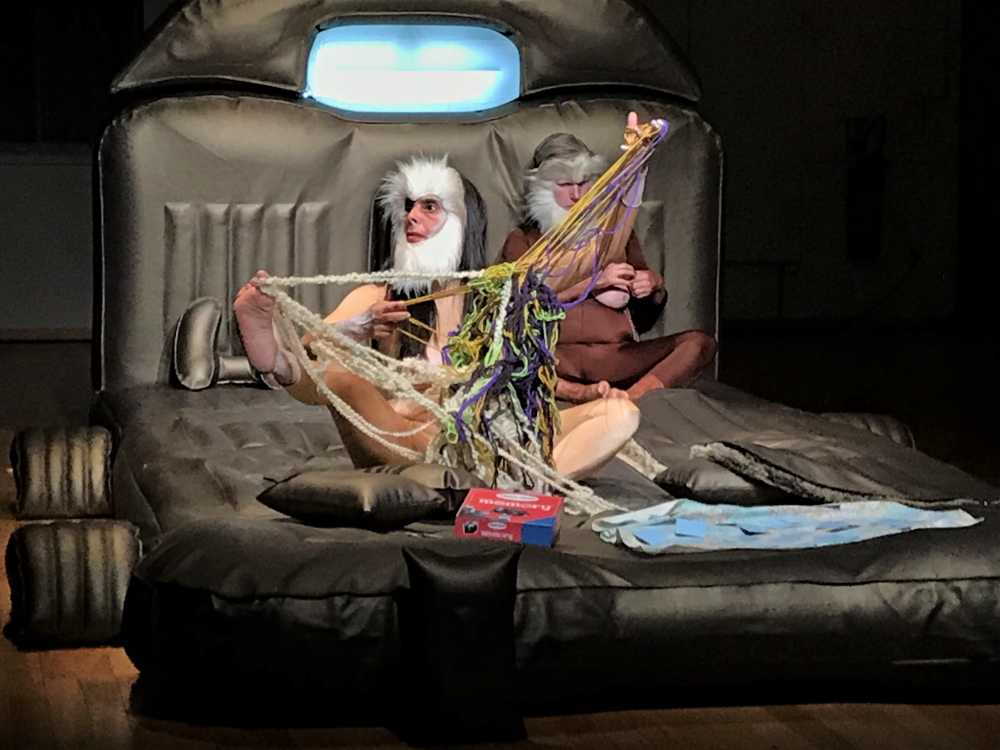 Dans la salle principale de l’Atelier de Paris, débarrassée de ses gradins, un énorme triangle de tables fut dressé pour accueillir les convives par centaines, pour un « banquet performatif. » Juste à côté, en passant par l’extérieur, on put entrer dans le studio et s’asseoir au sol pour observer deux étranges créatures, assises sur un praticable évoquant la banquette arrière d’une voiture familiale. Pendant trois heures et demie, un duo de faux primates s’adonna à des occupations humaines (ou presque). Ce spectacle est-il donc antispéciste ? Ce n’est pas impossible, mais il se peut que Consul et Meshie nous parle moins des primates que de nous autres humains.