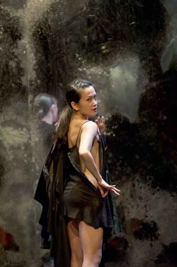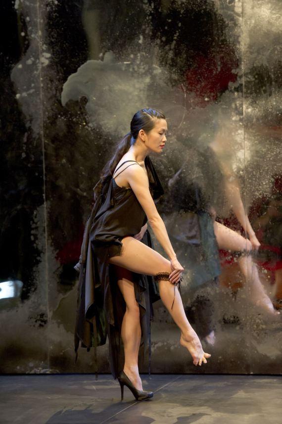 Dans Asobi (jeux d’adulte), Ito nous amène, peut-être, dans une sorte de cabaret japonais. Et on se souvient : À travers Tatsumi Hijikata (1928-1986), les origines du butô sont étroitement liées aux lumières tamisées et à l’érotisme. Sur le plateau on retrouve bien cette ambiance cosy, face à un mur de fond réfléchissant la scène, autant que, par moments, le public. Mais Kaori Ito n’a jamais pratiqué le butô. Tous les Japonais ne sont pas passés par la danse des ténèbres, et Ito se dit déjà bien éprouvée par tous ceux qui lui renvoient leurs phantasmes sur la femme japonaise.