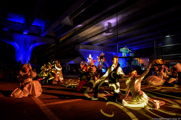 Le parkour, initialement appelé free running ou art du déplacement, art acrobatique et spectaculaire, poétique et solidaire, né dans l’espace urbain des villes nouvelles, est enfin invité à rejoindre la grande scène des arts de la rue. Dans une urbanité très contemporaine, le duel entre Thybalt et Mercutio se déchaîne sur des capots de voitures-bélier qui foncent l’un vers l’autre. Exubérance shakespearienne en rodéo de voitures… Où Roméo et Juliette se suicident ensemble, dans « le saut de la mort en automobile ».