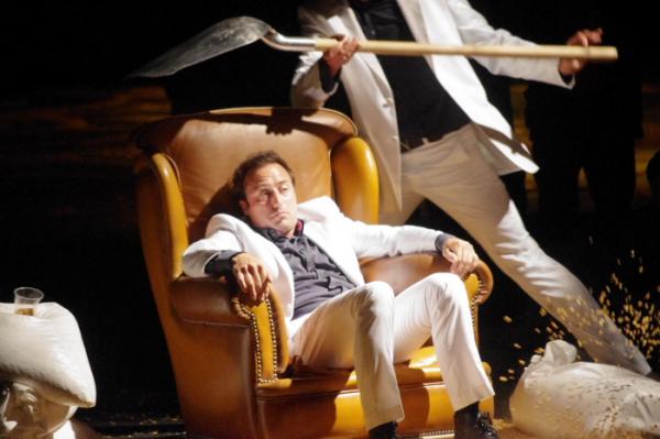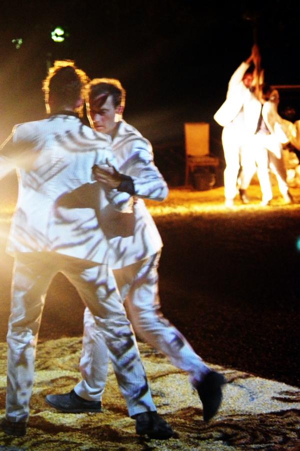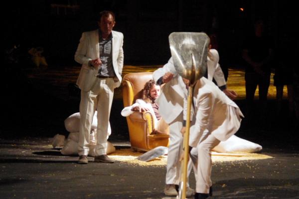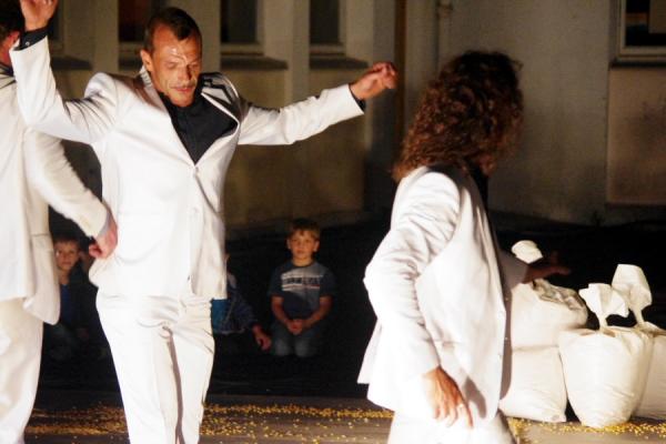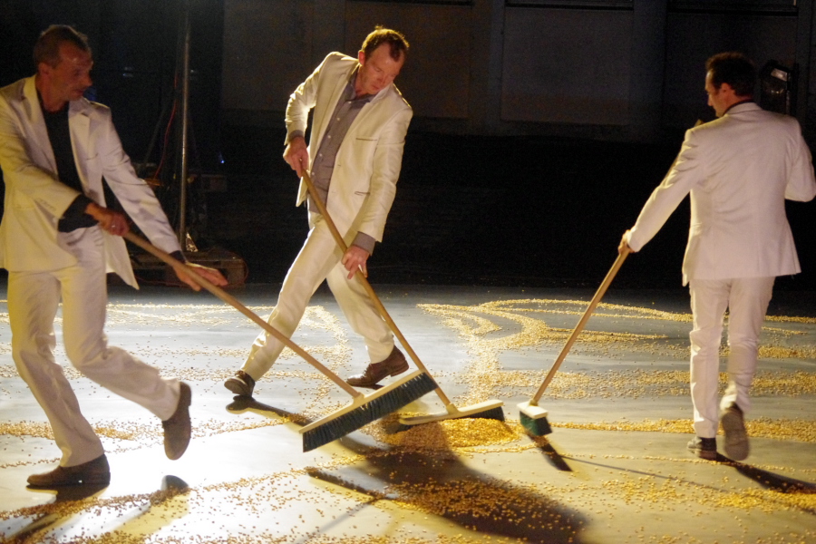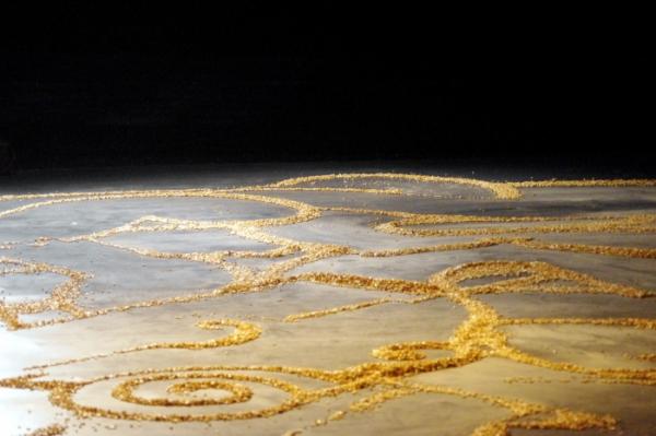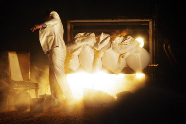 Mais le maïs comme fil conducteur, entre des tableaux très différents, manque de cohésion. C’est normal, c’est un produit en grains. Distribué au sol, il permet de réaliser des dessins, toujours recréés par le passage des balais et des spectateurs. Enfermé dans des sacs, il déborde dès qu’on le libère de son conditionnement, à grands coups de couteau, sous des projecteurs éblouissants. Polar, saga familial, western – tout se mélange. Et puis, on danse.