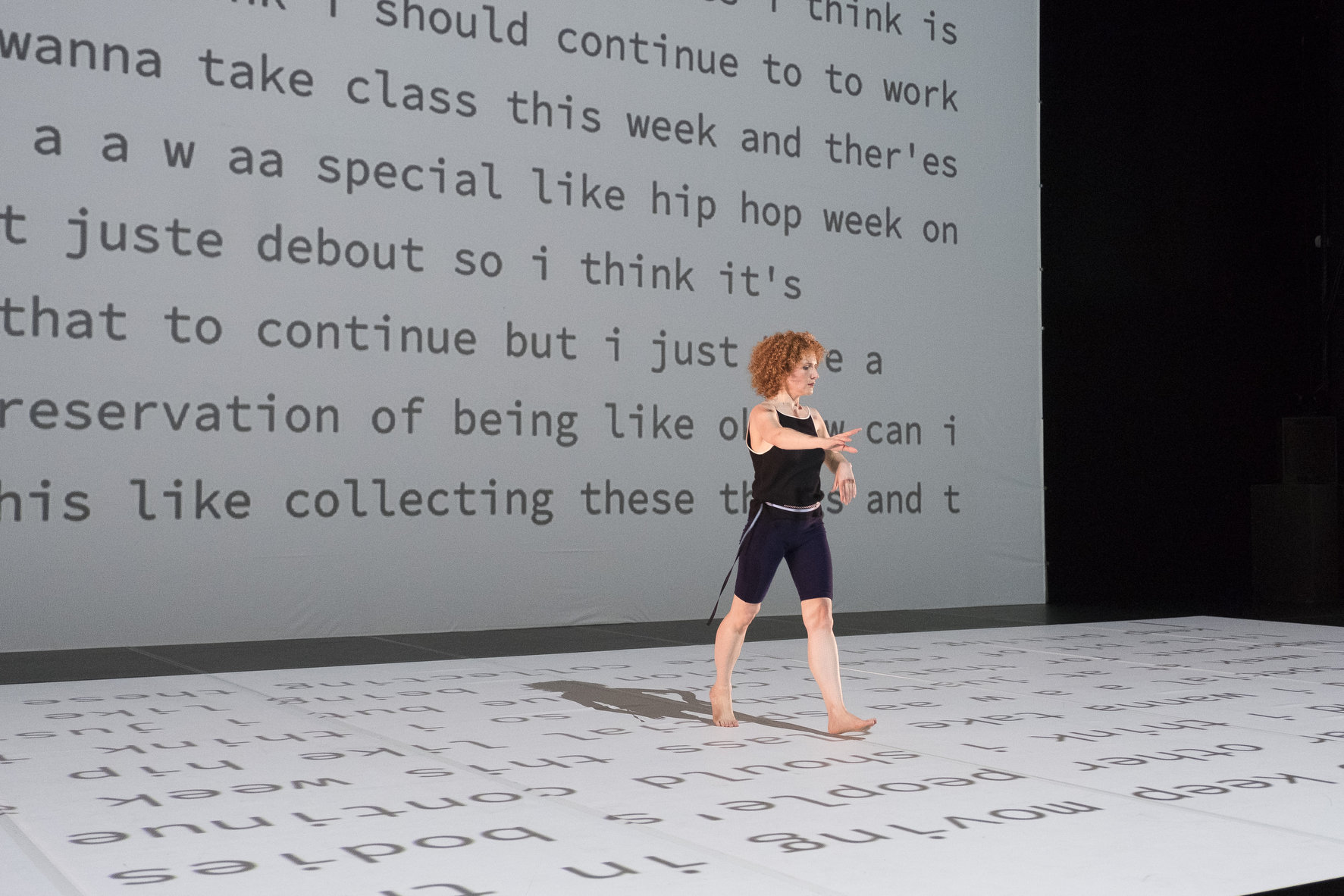 Très frontale sur le plateau, Liz Santoro est en fait accompagnée d'une présence à distance. Depuis New-York, sa fidèle interprète et collaboratrice Cynthia Koppe observe les images captées en live, de la danse en train de se produire. Le fond de scène est un écran immensément vierge. Il y a là un effet page blanche, qui inspire un grand potentiel de distances à habiter. Et cet écran se couvre incessamment des commentaires écrits en direct par l'observatrice : descriptions, références savantes, libres associations d'idées, jeux d'écriture.