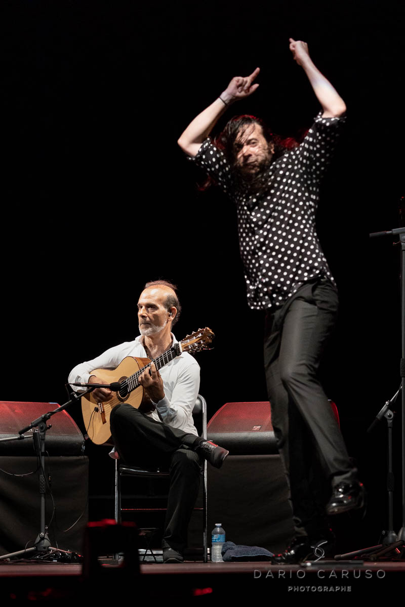 Le lendemain, au spectacle de Juan Carmona, l’Aubagnais transité par Xérès, on attendait donc un certain retour à une forme plus proche des racines. Ça commença par un solo à la guitare par Carmona, où l’on croirait, à la seule écoute, entendre un duo. Dans un savant crescendo, il invita ensuite ses amis musiciens (cajon, batterie, chant, palmas et bien sûr la flute traversière) pour préparer l’effraction de la danse.
