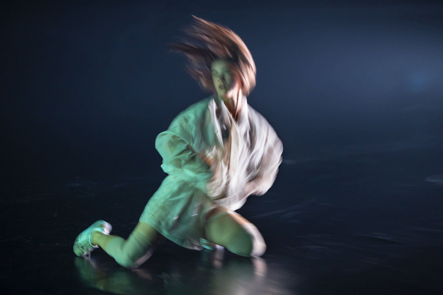 Tout commence par une reptation au sol, d’où se dégage une impression spectrale et presque hypnotique renforcée par les voiles qui habillent Dominyka Markevičiūtė. Elle entame un mouvement de torsion qui part uniquement du bassin, le corps comme scotché au tapis du plateau, qui fait penser à une noyée, ou une fille aperçue dans un rêve, avant que la nuit ne la baigne, ou dans une autre réalité. Les mouvements sont à la fois très liquides et désarticulés, comme une nage lente sous l’eau noire, qui finissent par former une spirale sans fin, comme les algues prennent la vague. Et il faut du temps, et que son buste remonte vers la surface avant de comprendre que ses bras sont entravés dans ses manches de mousseline et l’enchaînent et l’entraînent vers les profondeurs.