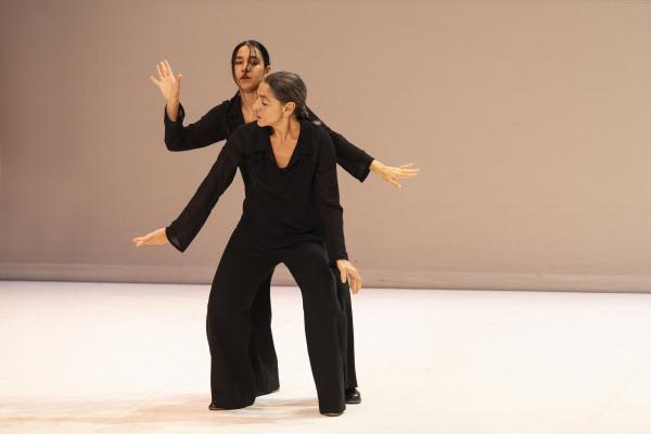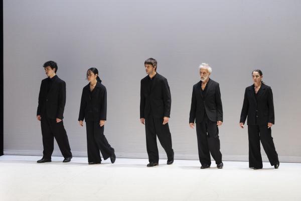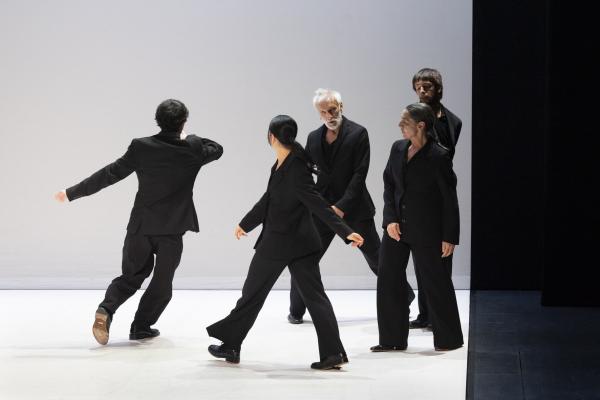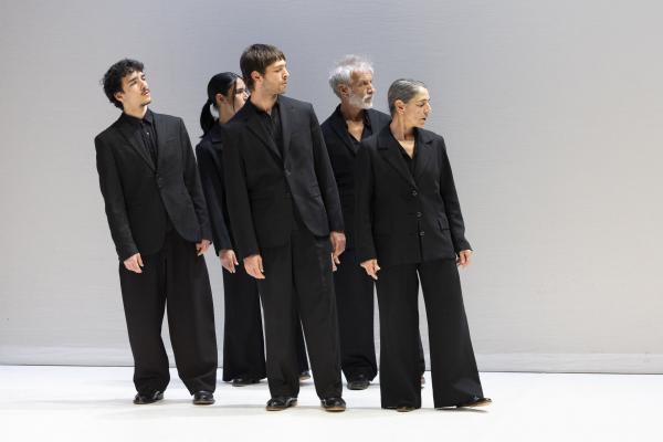 Les cinq enchaînent d’abord moult solos où chacun s’exprime à sa manière, et pourtant tous semblent réunis dans le sentiment d’être les branches d’un même arbre. Nul besoin d’insister encore sur la profonde fusion entre la fine gestuelle de Muñoz et les préludes et fugues de Bach. Nous l’avions vue dans la forme solo, accompagnée sur scène par Dan Tepfer au piano en 2023 sur le même plateau, au Théâtre des Abbesses. Elle dit l’interpréter aujourd’hui bien différemment qu’à la création quand elle avait quarante ans. Ajoutons qu’en version famille, Muñoz ne peut céder son rôle à Federica Porello avec qui elle continue à interpréter la version solo en alternance. Sans parler du fait que pour la version quintette, les préludes et fugues choisies ne sont pas tout à fait les mêmes. Il s’agit bien d’une re-création.