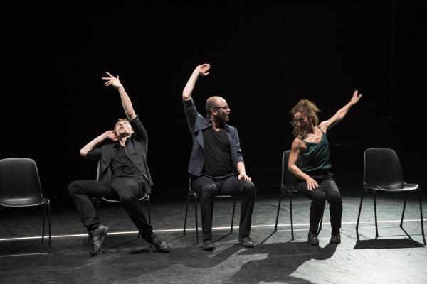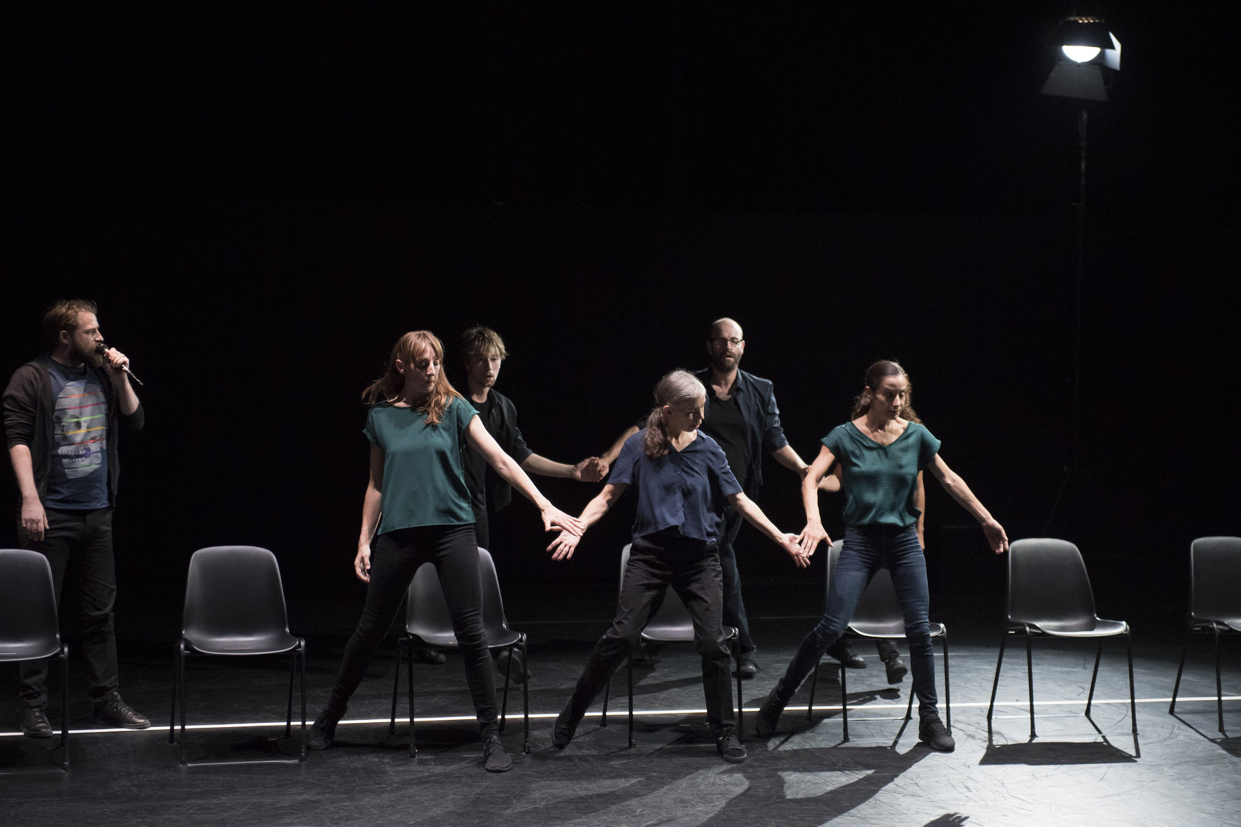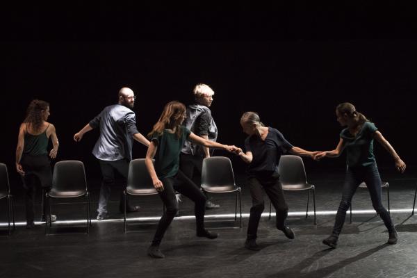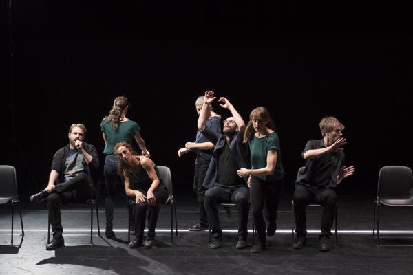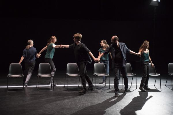 Ces quelques mots sont le leitmotiv d’une longue diatribe sur la vie écrite et formidablement bien dite par le comédien David Mambouch. Sur scène, apparaissent quatorze chaises pour six danseurs (quatre femmes et deux hommes) et le conteur micro à la main. Sur la cadence des phrases, les interprètes dessinent une danse qui, tout comme le texte, ne s’arrête jamais, entre de multiples torsions du corps alors qu’ils sont assis et délicats jeux de déplacements autour des chaises. Souplesse, mouvements très liés, glissements, regards de complicité, arrêts sur image, sont censés exprimer différents personnages de la société sans jamais alourdir le jeu.