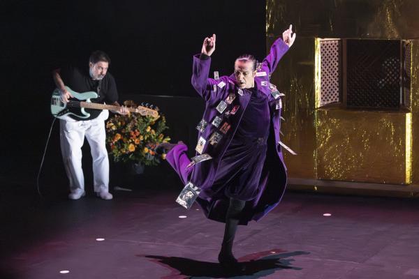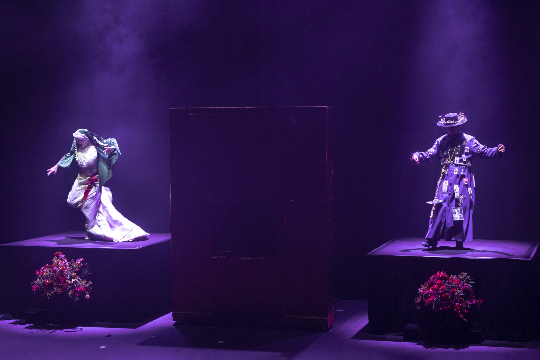 Matarife y Paraíso déploie un imaginaire flamboyant, entre Dante, Séville et les rites archaïques. Le spectacle puise dans deux sources majeures : La Divine Comédie, la Semaine Sainte de Séville. Mais loin d’en faire un collage, Marín les fond dans une dramaturgie instinctive, presque hallucinée. Les images se succèdent comme des visions : un manteau violet couvert d’images pieuses, une Vierge en gaze transparente qui surgit telle une apparition, des bras en croix, un organiste derrière une grille dorée, mi-confessional, mi-moucharabieh et des cornets genre Centurions romains qui déchirent l’air . Ce sont Manuel López « armaos » de la Centurie romaine de la Macarena, et Francisco Javier Pérez, directeur musical de la Banda del Sol.