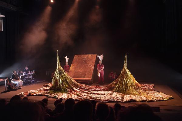 Autour du duo, les musiciens forment un chœur incandescent : Antonio Campos, chanteur-boucher, guitariste et bassiste ; Susana Hernández « Ylia » aux claviers et à l’électronique ; Daniel Suárez aux percussions ; Manuel López au cornet, silhouette saisissante venue de la tradition sévillane. Tous participent à cette matière vivante, hybride, où le flamenco dialogue avec l’électro, le baroque, le rituel. Les costumes de José Miguel Pereñíguez, les lumières sculptées, les apparitions presque surréalistes composent un univers d’une force visuelle rare. La dernière image : deux danseurs qui disparaissent dans une église miniature qu’ils viennent de bâtir, comme s’ils entraient dans leur propre mythe est absolument magique. Une porte ogivale, une tour improvisée, un geste d’enfant devenu geste d’artiste. Le plateau se vide, mais l’air reste chargé, exalté.