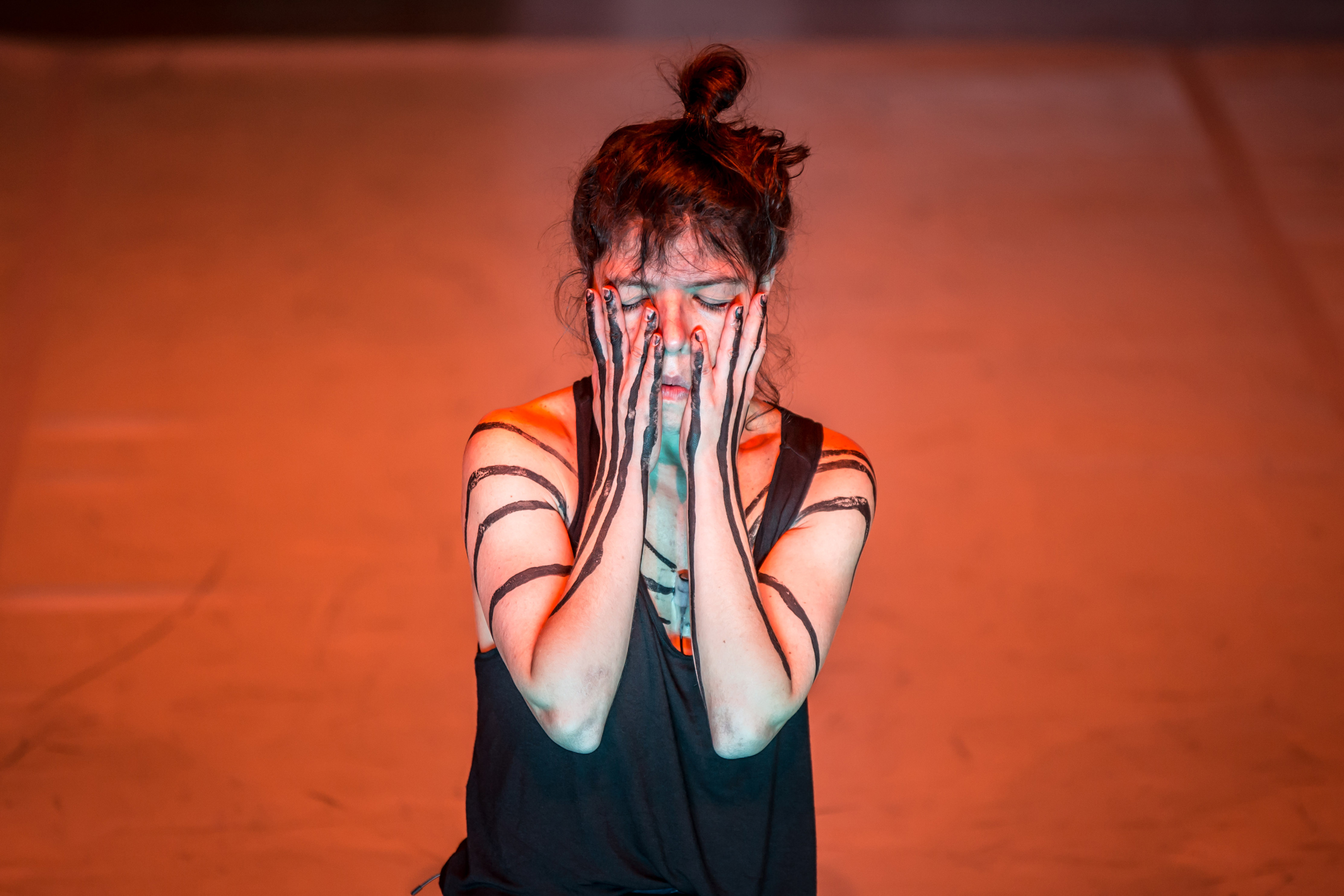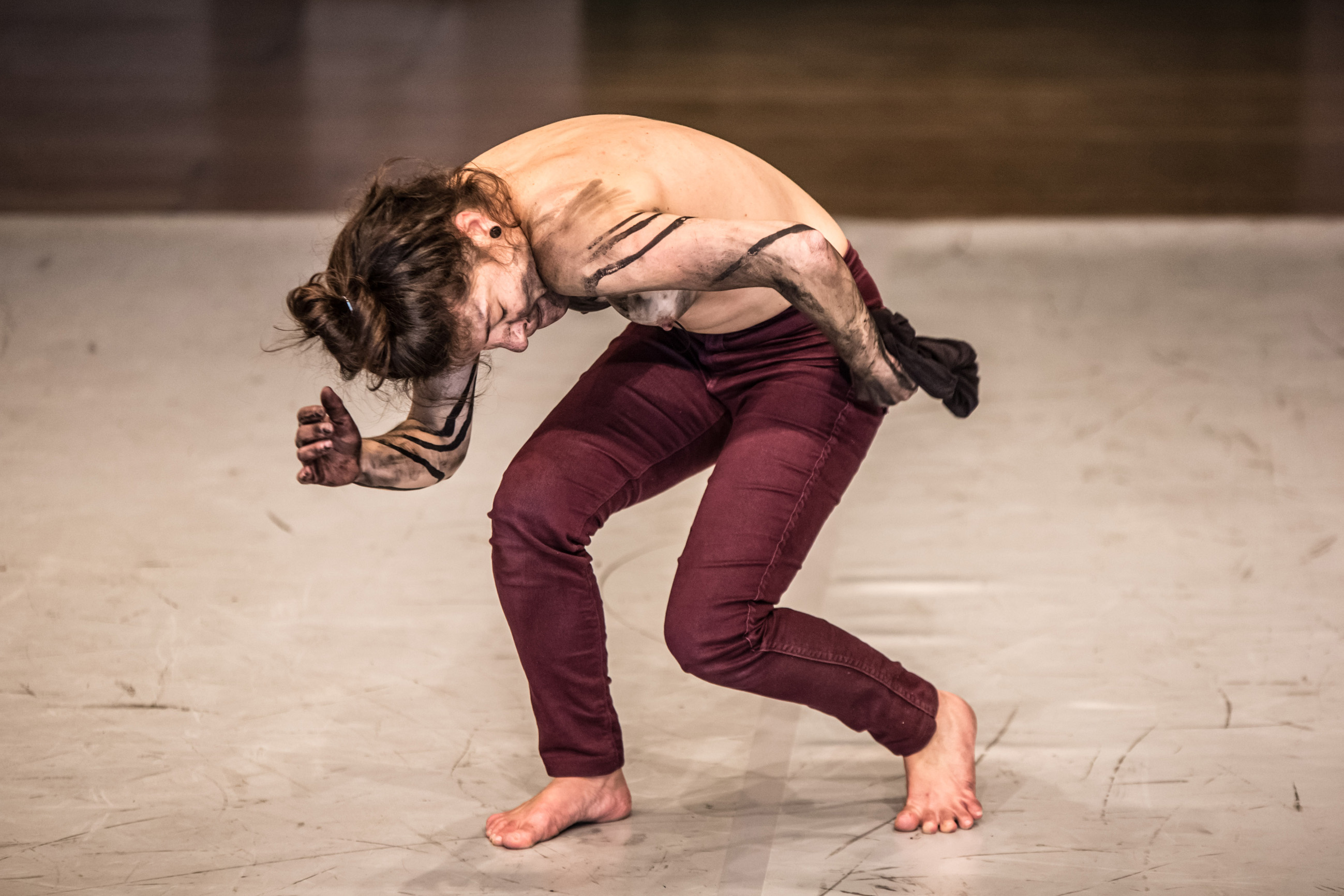 Dans Fole, la désarticulation va jusqu’au langage qui s’atomise, et devient in-signifiant, tandis que sa danse, uniqement basée sur le souffle, la respiration, la vibration jusqu’à l’hyperventilation, tend à une instabilité. Si le mot Fole signifie « soufflerie » nous entendons bien sûr en français la contigüité avec la folie. Dans cette performance à bout de souffle, Michelle Mourra met en jeu une nouvelle définition du corps dansant, déplaçant le sens du mouvement vers la sensation et créant un paradoxe entre « se mouvoir » et « être mû ». Couverte de lignes noires qui la rayent et la font sortir du champ de l’humain ordinaire pour la transformer en sorcière, en fétiche ou en animal, et se rapprocher ainsi des états seconds que provoquent aussi ces modulations du souffle. D’ailleurs, à la fin, il ne reste d’elle que quelques traces noires sur le sol, comme si son incarnation s’était littéralement volatilisée.