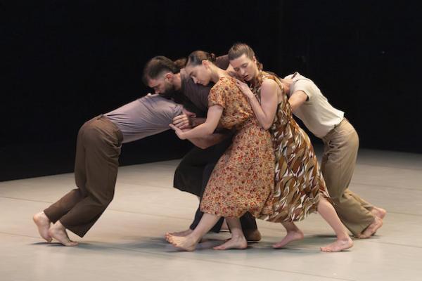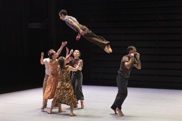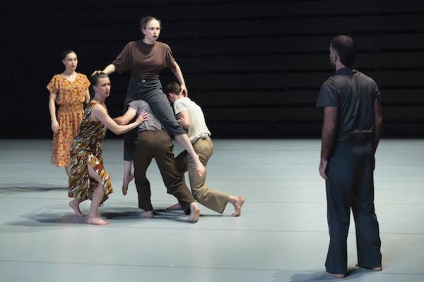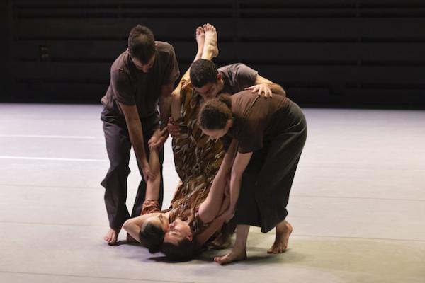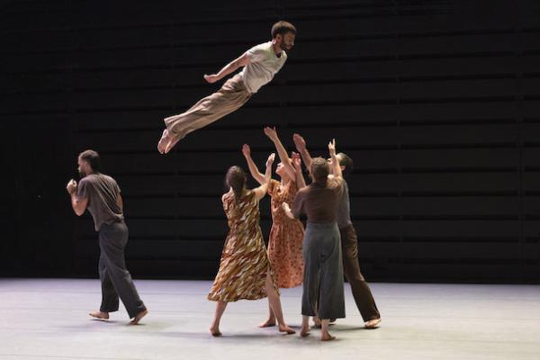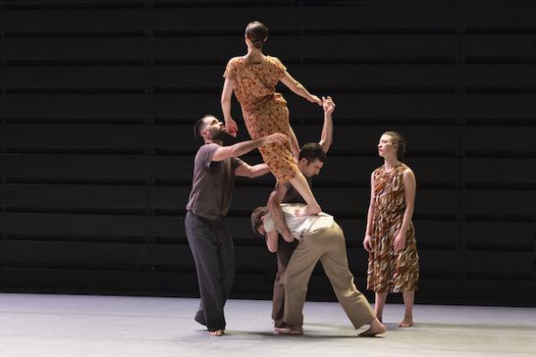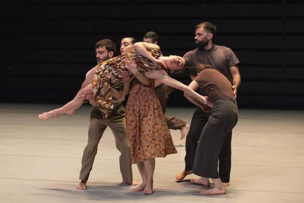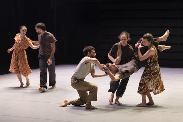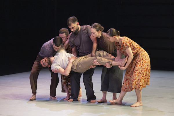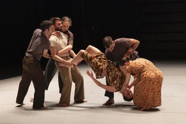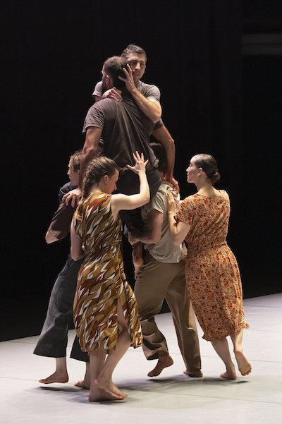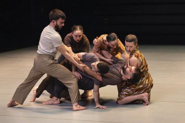 Ce travail préalable se traduit ensuite dans la confrontation avec les danseurs pour bâtir cette pièce et construire une chorégraphie. La nature d’une chute, c’est la traduction que l’on pourrait proposer pour le titre choisi par Adi Boutrous. Mais il s’agit davantage d’un mouvement perpétuel car la chute induit de se relever. Comme à l’accoutumée, le chorégraphe fait évoluer les six interprètes dont lui-même sur une scène nue, sans décor et délicatement éclairé par Ofer Laufer. On perçoit comme le son du vent et d’une tempête qui menace quand les trois danseurs et les trois danseuses pénètrent sur le plateau. Ils avancent resserrés comme amalgamés les uns aux autres. Débute une série ad libitum de figures qui vont décliner les milles et une manière de chuter : en douceur ou brutalement, en avant, en arrière, sur le côté. À chaque fois le groupe se reforme à la recherche d’un nouveau centre de gravité. Ces séquences induisent un abandon des corps et une danse qui accepte le lâcher-prise. Elle est constamment émaillée de portés acrobatiques d’une intensité remarquable et de pyramides qui exigent une confiance absolue dans ses partenaires. Adi Boutrous imagine ainsi des figures complexes sur des sons qu’il a lui-même inventés. Il y instille des séquences au sol où les danseurs rampent sur le dos. Survient sans qu’on s’y attende un arrêt sur images : les corps inertes, entassés. Immanquablement cette image puissante fait affleurer le monde réel, celui d’une région meurtrie d’où viennent le chorégraphe israélien et ses danseurs. Les images s’imposent sans qu’il soit besoin d’être démonstratif. Ainsi on perçoit plus tard dans un mouvement d’élévation collective une figure christique bouleversante.