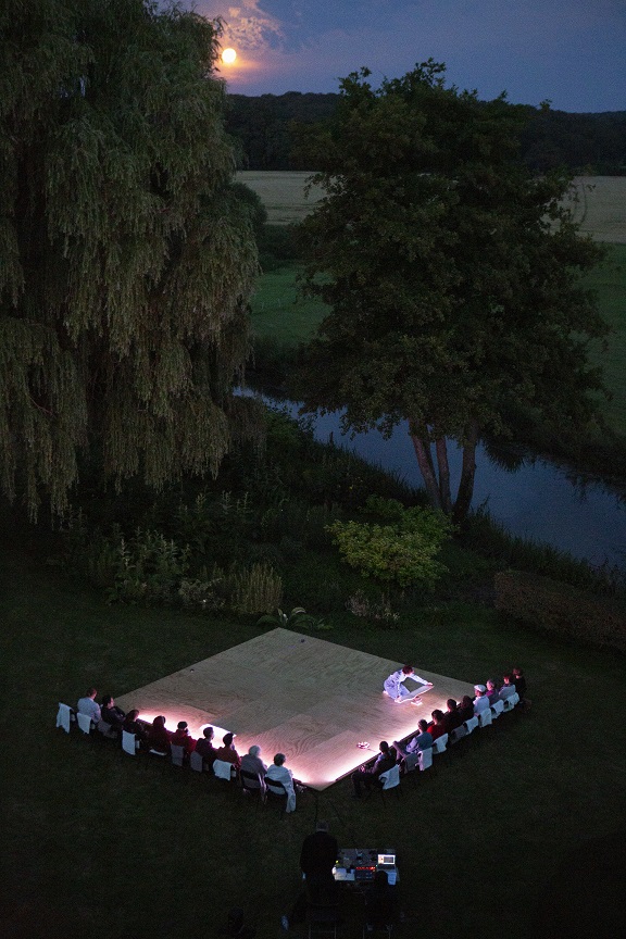 Mais comment une pièce comme Not I, avec sa simplicité et sa sobriété, peut-elle passer de la communion avec les habitants d’un village au cadre d’un château ? Il est certain que la rencontre ne se serait pas produite si Jean de Pange n’était pas comédien et metteur en scène. Fondateur et directeur de la compagnie Astrov, basée à Metz, il est lui- même familier du travail de la compagnie Li(Luo) de Camille Mutel qui explique les circonstances: « Il avait vu le spectacle et savait que nous avons dû annuler les représentations prévues à Avignon cette année. En plus, il cherche à relancer l’activité culturelle à Pange. » Et pourtant: « Au départ, donner le spectacle au château ne faisait pas sens pour moi. Ici, c’est un lieu historique à part, on n’est pas dans un vrai village. Mais ensuite, l’idée est venue de travailler avec le paysage. »