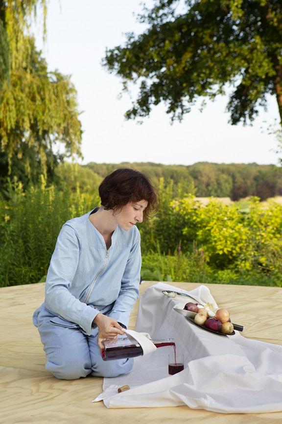 Une planche de bois naturel, un étau, une nappe blanche, des oignons, un couteau, un poisson, une bouteille de vin : Dans sa tunique bleu ciel, Mutel étire le temps pendant qu’elle achemine et prépare les ingrédients de sa composition plastique et visuelle pour finalement tendre un verre de vin rouge à une personne assise au premier rang (qui est souvent le seul). Elle met en scène un don de soi, un lent rituel du partage – non d’un repas, mais de son idée ou de son essence, où il ne s’agit pas de se nourrir mais de rendre hommage à la vie. C’est en ce sens qu’à Réméréville, village de 400 âmes où elle vit, Mutel demanda aux spectateurs d’amener leurs propres objets ou aliments, pour composer la nature morte finale.