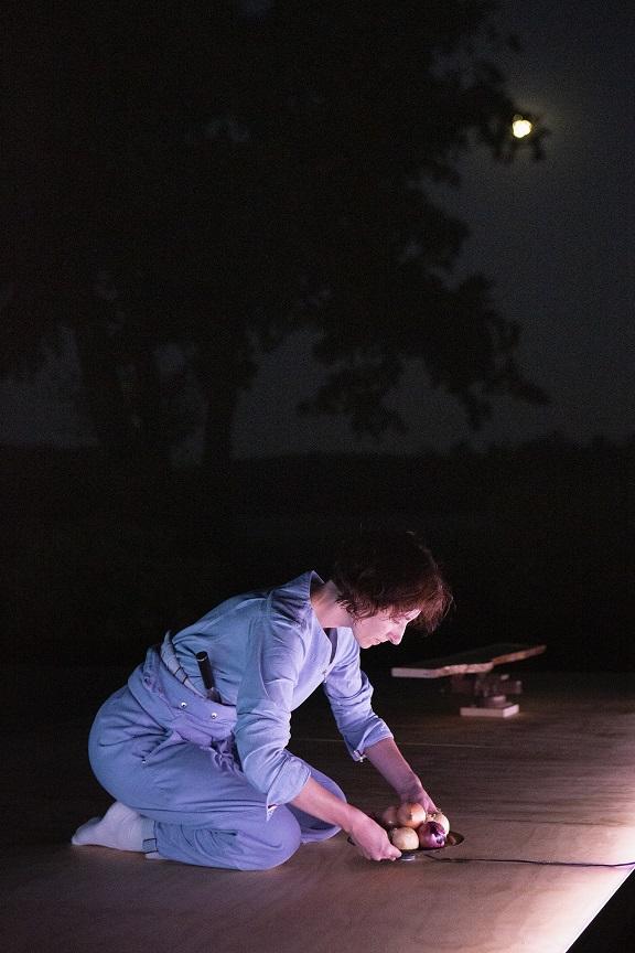 Ensuite, à la nuit tombée, Mutel redonne le spectacle, cette fois sous la pleine lune. Côté public, quelques têtes se distinguent vaguement, comme dans une pintura negra de Goya. Sur le plateau, la maîtresse des cérémonies semble avoir traversé de vastes espaces-temps pour venir jusqu’à nous. Son personnage est porteur d’imaginaires alors que le clair-obscur estompe certaines parties de la nature morte pour en souligner d’autres, comme les écailles argentées qui brillent dans le noir quand Mutel présente le poisson en le tenant par la queue. Le crissement permanant des pneus sur les routes devient une musique contemporaine qui résonne en harmonie avec l’environnement sonore créé par Jean-Philippe Gross.