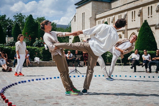 Il n'y avait rien de très facile dans le contexte de création de la pièce Orbes, de Jordi Galí – chorégraphe catalan installé à Lyon, et pour trois ans artiste accompagné par la Briqueterie, CDC du Val-de-Marne en banlieue parisienne. Cela se déroulait dans la cour d'honneur du Musée Rodin, sur un sol pavé inégal, sous soleil et chaleur oppressants, en plein jour sans lumière dédiée ni musique, devant un public qui n'était pas venu pour ça – quoique tout à fait aimable. Pour conclure cette liste de handicaps, la monstration des structures fines et complexes de Orbes se fait là dans une ouverture à tous les vents, qui n'a rien pour focaliser et encourager l'attention.