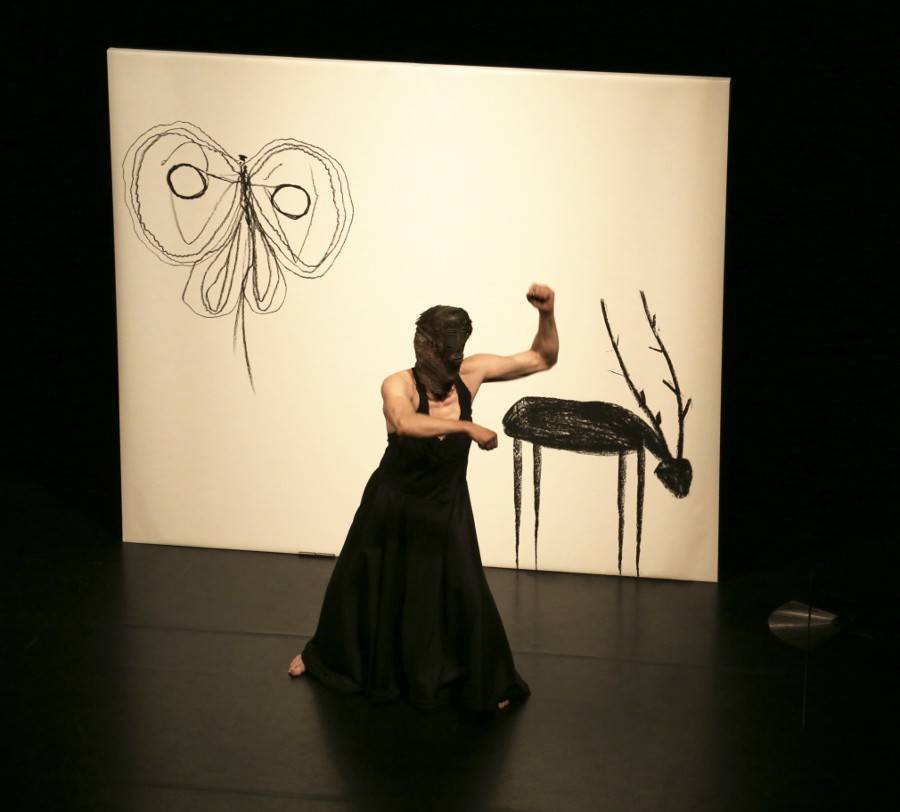 Le son de l’éventail du début est donc un rappel de la fin du poète, et Penzum un requiem qui lui est adressé, sous forme d’une séance de poésie-action, porté par la scansion de la contrebasse. Le geste âpre, tendu et cabré, Nadj dessine des motifs issus de l’univers du poète: Un papillon, un insecte géant, un arbre, un soleil noir… Il se jette au sol tel un insecte retourné sur sa carapace, puis s’élève pour apparaître en cerf, allant vers une libération, un apaisement. Le passage est réussi, sa première œuvre post-CCN est née, dans un retour aux sources littéraires et linguistiques. Penzum est une petite forme, un nouveau départ.