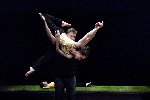 Sur le tapis de danse, Valli déroule: Deux bandes de gazon (comme dans certaines de ses pièces précédentes), deux carrés verts et de l’eau, pour une femme au soleil, ou plutôt deux, chacune face à son admirateur. Jamais tout à fait les mêmes, jamais tout à fait différentes. Ou bien est-ce la même, cernée par une seule paire d'yeux? Après tout, l'œil gauche ne voit jamais tout à fait la même chose que l'œil droit…