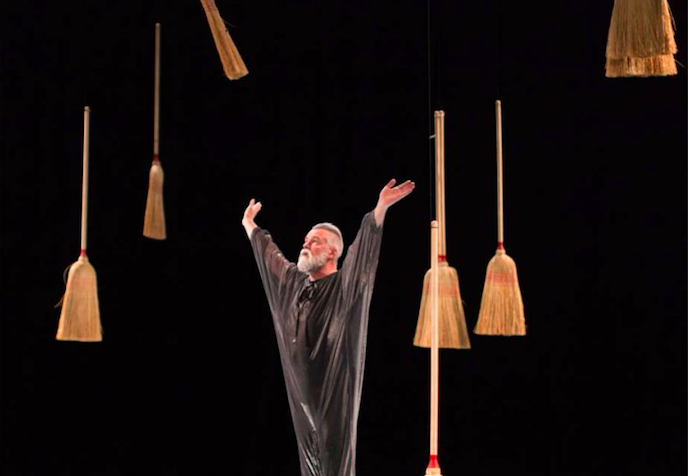 Pour Littéral, Daniel Larrieu invite ses cinq apprentis-sorciers à sa fête d’anniversaire. Un balai comme une bougie donc, pour un vieux chamane de la danse contemporaine qui s’amuse à ironiser sur ses « soixante balais ». En même temps Larrieu accède, par son solo initial, au cercle des grands maîtres comme Amagatsu ou Teshigawara, qui se mettent en scène face à leurs apprentis, dans des solos distillés à l’extrême, décennie par décennie.