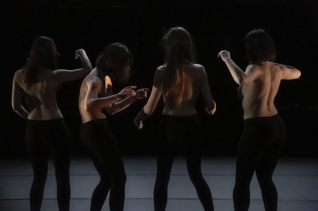 Les quatre dos nus, jambes noires fondues dans l'ombre, sont déjà au plateau. Comme une chorus line de cabaret vue depuis le fond de scène. Une façon de jouer de l'exclusion du regard, mais aussi de son exacerbation, que l'on se souvienne du fameux If you couldn’t see me (1994) de Trisha Brown… Mais cette fois, cette manière de logique apotropaïque (qui fait détourner le regard comme s'il était un mauvais sort) se double d'une construction par amplification et accumulation du mouvement très maîtrisée. Difficile, en effet de savoir quand cela débute. Certes, un geste puis une sorte de houle parcourt certains des dos qui se distinguent des autres. La lumière monte lentement autant qu'enfle la gestuelle, répétitive et maîtrisée. Une déclinaison de port de bras très doux et se répondant, en écho ou en miroir, quelques inclinations des mains. Très lentement un mouvement de rotation dégage au regard les flancs et un peu des rondeurs des seins, jouant sur une attente que l'on n’évite guère (une sorte de « les montrer ou pas ! ») tant cette apparition reste chargée de force érotique et transgressive : érotique puisque les jambes apparaissent maintenant clairement chaussées de talons hauts et noirs ce qui connote ; transgressive car toute la gestuelle tendait jusqu'alors à suggérer cette apparition tout en la refusant…
