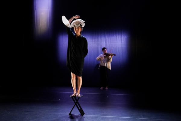 Avec Akiko Hasegawa, c’est une sorte de grand oiseau qui apparaît sur le plateau, avec sa robe multicolore parsemée de clochettes aux teintes de soleil couchant, et son hoodie bleu nuit qui, sur ses bras arrondis, repose comme des ailes. Cette reine de la Nuit d’un nouveau genre reprend bientôt à son profit quelques éclats du fameux Lamentation (1930) de Martha Graham dont la chorégraphe a étudié la technique. Le ton, comme le sujet est donné, Kanashimi signifiant tristesse. À travers cette création, Akiko Hasegawa suit tout le parcours des étapes du deuil : le choc, le déni, la colère, la tristesse, le marchandage, la résignation, l’acceptation, la reconstruction. Sa gestuelle, délicate, habitée, est soutenue par les harmonies de la violoniste Aline Zeller, cette dernière ayant composé une sorte de partition à partir d’un pot-pourri de morceaux pouvant évoquer la tristesse, donné par des proches.