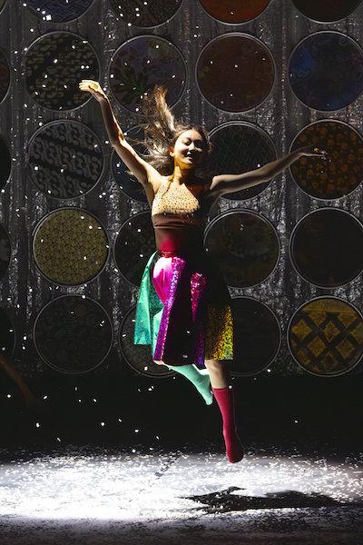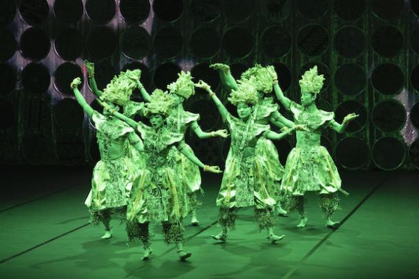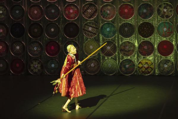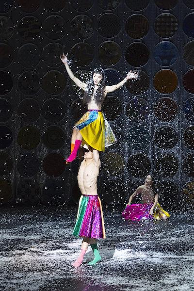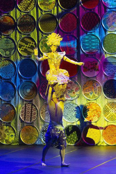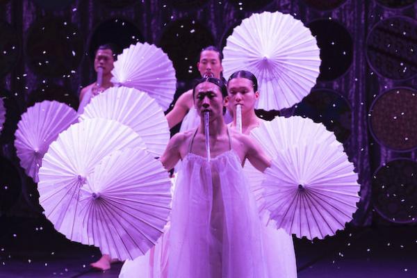 Pas certain qu’Eun-Me Ahn connaisse Segalen, mais un peu du poète breton ne nuit pas pour appréhender sa nouvelle création, ne serait-ce que pour prévenir les malentendus. Car Post-Orientalist Express peut déconcerter… Véritable maelström d’images et de saynètes enchaînées à toute vitesse, passant de la jeune femme à l’ombrelle, pour fond de verre à liqueur (mais pour tout public quand même), aux deux masques marchant sur les mains avec des airs de dragons informes et qui, sautant sur leurs pieds, retournent le costume, devenu sobres jupes blanches, les transformant en austères danseurs butô, kaolin en moins. On y croise des saris, des coiffes fleuries, des bouddhas dorés, des émules de Bruce Lee avec nunchakus, des super-héros de dessins animés façon Chevaliers du Zodiaque du studio Toei Animation, un étourdissant mélange flashy, au gré des 90 costumes créés par la chorégraphe, qui démultiplient l’effectif au point qu’il faut un certain temps pour mesurer qu’ils ne sont que huit… La chorégraphe elle-même s’ajoute à l’effectif à l’occasion de deux solos ; comme le faisait dame Pina en son temps, mais en plus débridé.