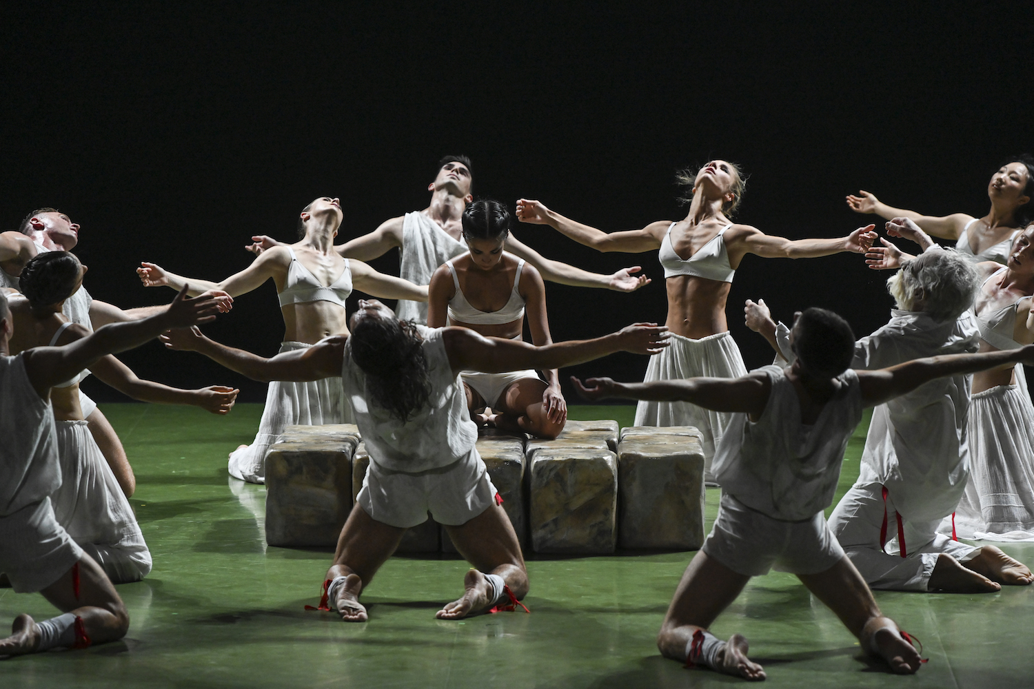 Le Sacre du printemps de Martin Harriague est sculpté d’une autre façon. Le chorégraphe impose un style de danse très personnel, avec des pas extrêmement rapides, juste un petit sursaut, une jambe qui se lève ou croise l’autre en 2 secondes, des déplacements complexes et jamais répétitifs, des tableaux vivants superbes. Il est très inventif ce jeune homme et impose aux artistes une concentration absolue afin que rien ne soit laissé au hasard, que tout fonctionne comme il l’a imaginé en donnant le sentiment d’une certaine facilité, alors qu’il est évident qu’il n’en est rien.
