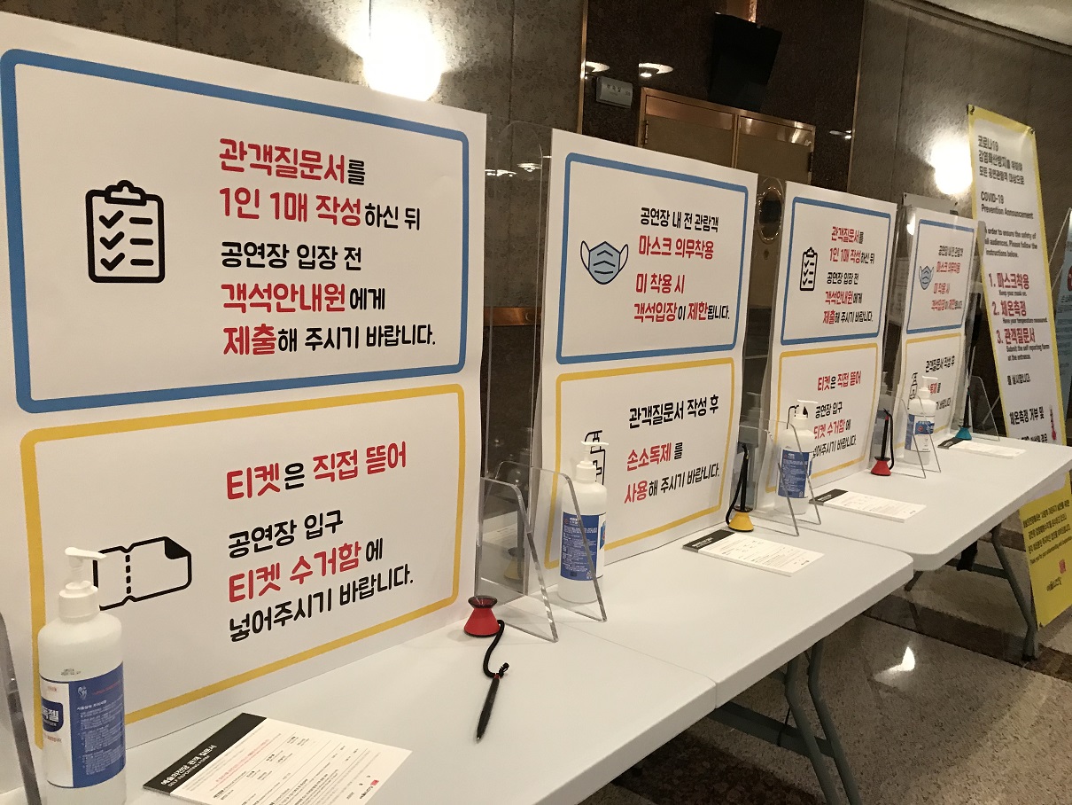 Les mesures sanitaires au CJ Towol Theater sont drastiques. A l’entrée de la salle, tout le monde doit remplir une déclaration: Présentez-vous des symptômes de Covid-19 ? Votre température dépasse-t-elle 37.5°C ? Avez-vous séjourné au cours des derniers 14 jours à un endroit où a eu lieu une transmission intracommunautaire de Covid-19 ? Il va de soi que tout le monde qui entre dans le théâtre doit impérativement porter un masque respiratoire. Et tout le monde veut ici dire : 400 personnes, au lieu de la jauge de 1.100 places. 400 personnes, soigneusement installées en quinconce avec interdiction de s’asseoir côte à côte, même pour les personnes d’un même foyer ! Les mesures sont drastiques, mais à prendre ou à laisser.