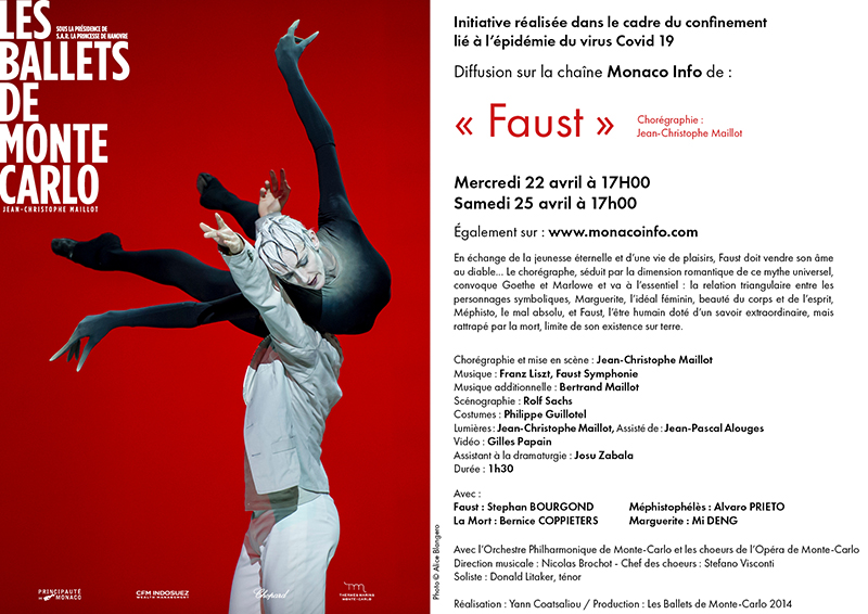 En raison du confinement lié à l’épidémie du virus Covid-19, Les Ballets de Monte-Carlo avec la chaîne Monaco info et le site France 3 PACA, offrent à tous, la possibilité de voir ou de revoir une sélection d’œuvres de son répertoire.