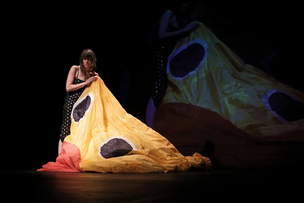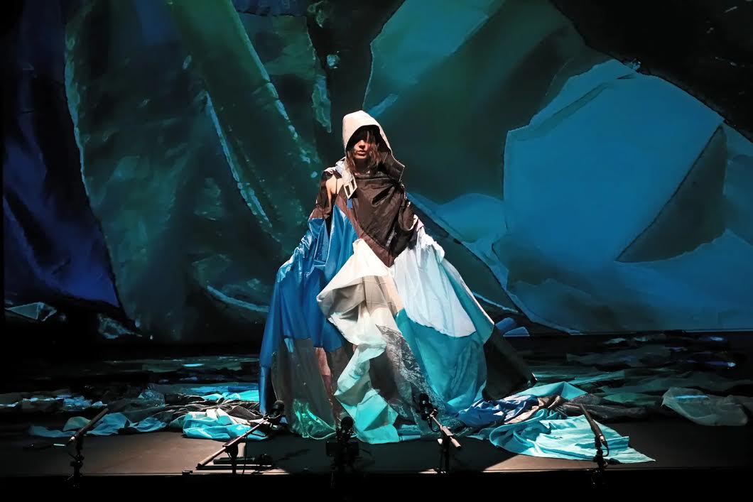 Resta Camille qui s’efforça à tenir le cap, dans un « océan de plastique » (le thème aquatique de la soirée étant abordé de façon vaguement écologiste), la scénographie étant faite d’une énorme toile composée de vieux sacs et anoraks, façon radeau de la Méduse. « Donc il y a une chorégraphe et il n’y a pas de chorégraphie » constata la chanteuse, dans un jeu de clins d’œil comme on en trouve chez Orlin aussi souvent que les titres sans fin. Et pourtant. « J’ai des restes de danse, j’ai fait pas mal de classique » confia-t-elle au public et au petit canard jaune, également récurrent chez Orlin, qui fut ici son meilleur partenaire de dialogue.