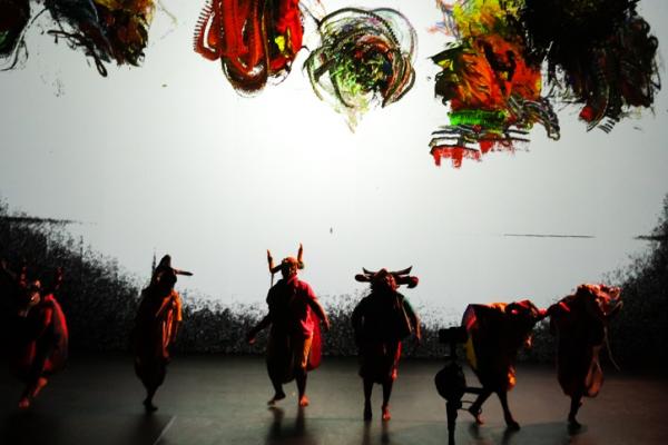 Et à Chaillot, heureusement, tout le monde était sur le plateau, de la (sublime) chanteuse soliste à la chorale chorégraphique de la compagnie Moving into Dance Mophaton, pour un concert dansé qu’on imagine sublime, même après l’avoir vu. Car une fois de plus, Orlin perd son spectacle entre la scène et l’écran. Le bonheur qui s’installe quand les chanteurs-danseurs établissent un rapport direct avec leur public est à chaque fois bien trop éphémère. Ici, pas seulement un grand écran et des caméras, mais en plus des effets visuels multiples, de la démultiplication au mixage avec des images d’animation. Impossible de définir dans quel espace ils font rouler leurs rickshaws imaginaires. Sur scène, à l’écran ou dans l’entre-deux ?