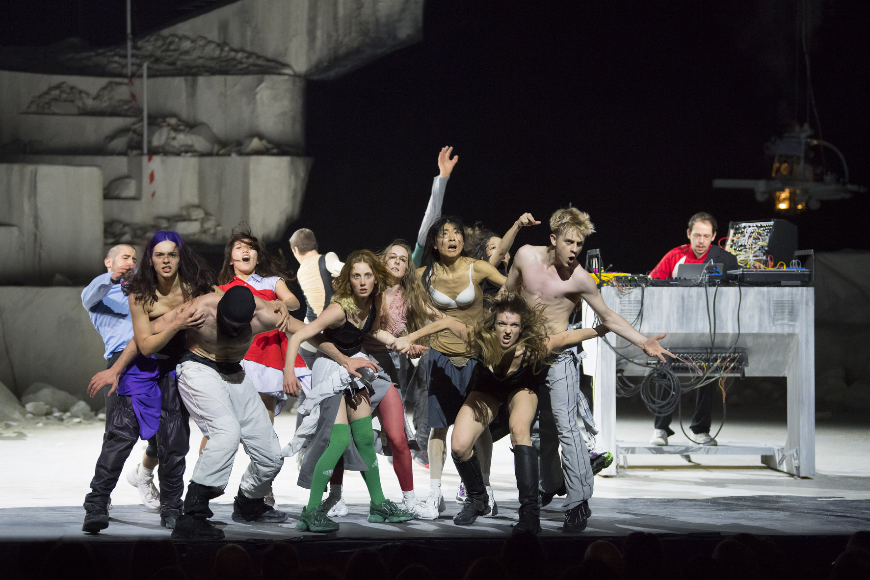 Room with a View a tout d’une évolution, comme si cette création découlait directement de la précédente. L’esprit du club techno de Tbilissi, le Bassiani, avec son opposition à la politique du gouvernement géorgien s’y prolonge, tout comme la vision d’une pierre chargée d’histoire. Dans le paysage improbable d’une carrière industrielle, un DJ emmène une bande de jeunes dans ses envolées et les teufeurs le lui rendent bien. La scène est dans les bas-fonds d’un monde probablement dystopique où une vingtaine de jeunes laissent éclater leur énergie, leurs pulsions et leurs rêves. Un bloc de pierre haut de dix mètres, des gravats, eux aussi de volumes impressionnants. Où l’on se croit sous un pont d’autoroute effondré ou dans les ruines du stade de football de Tbilisi, là où se trouve le club Bassiani.