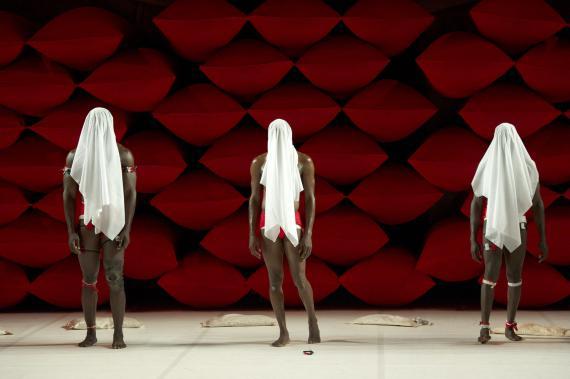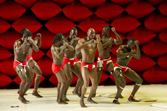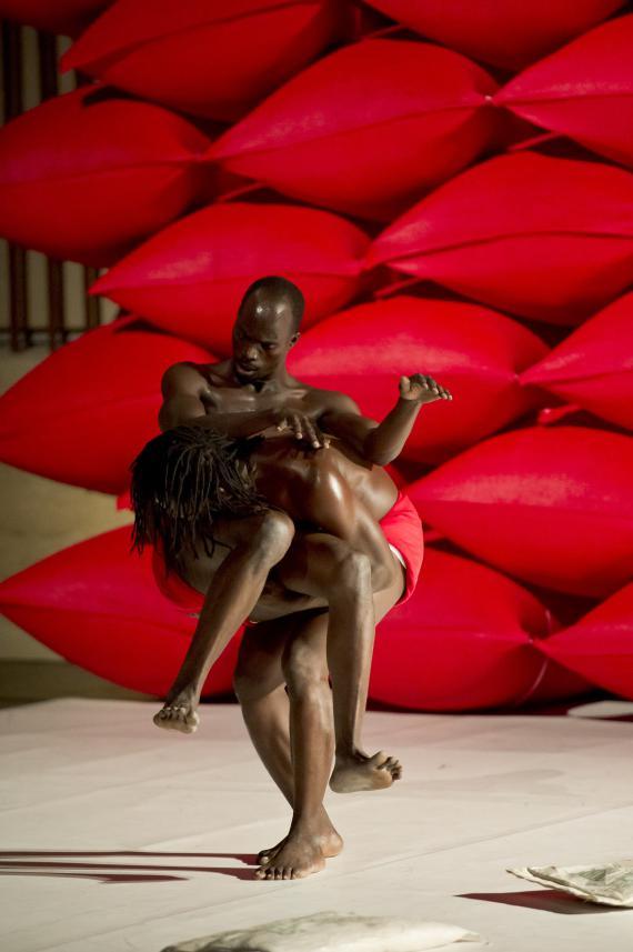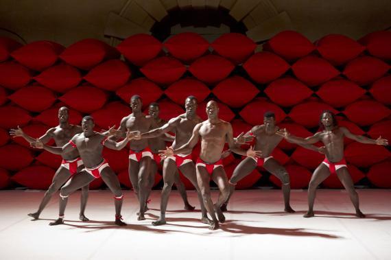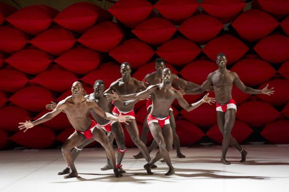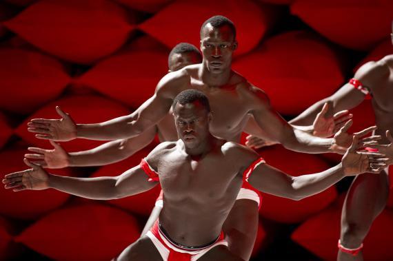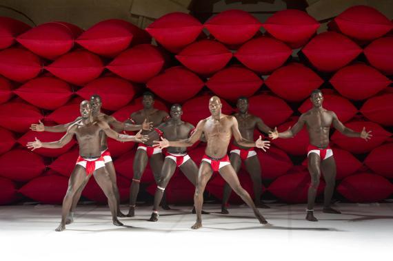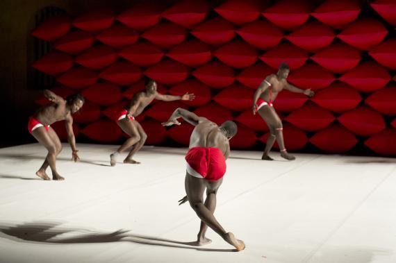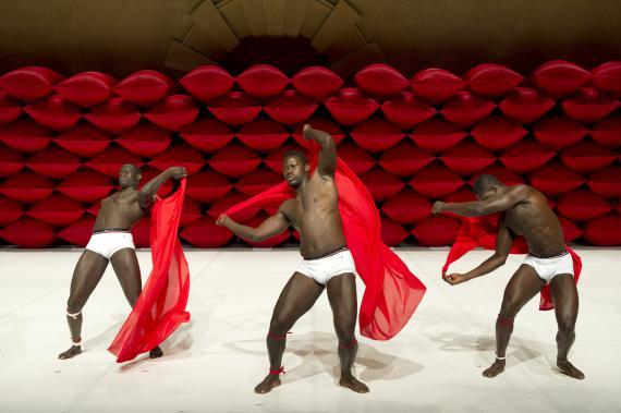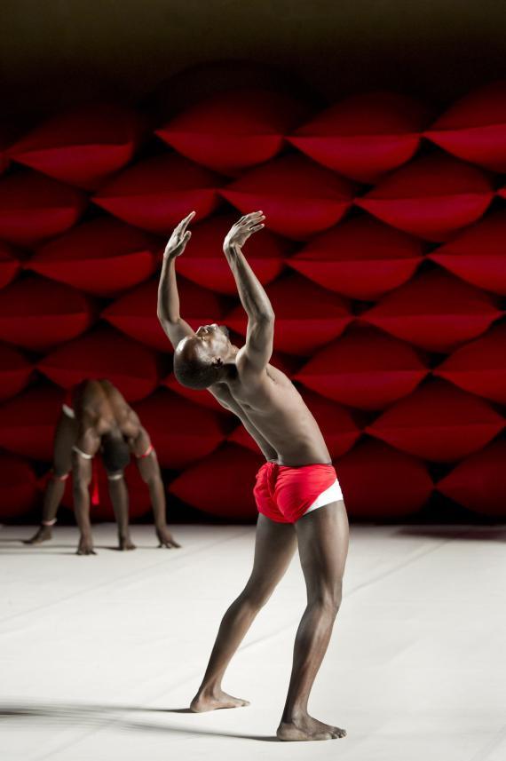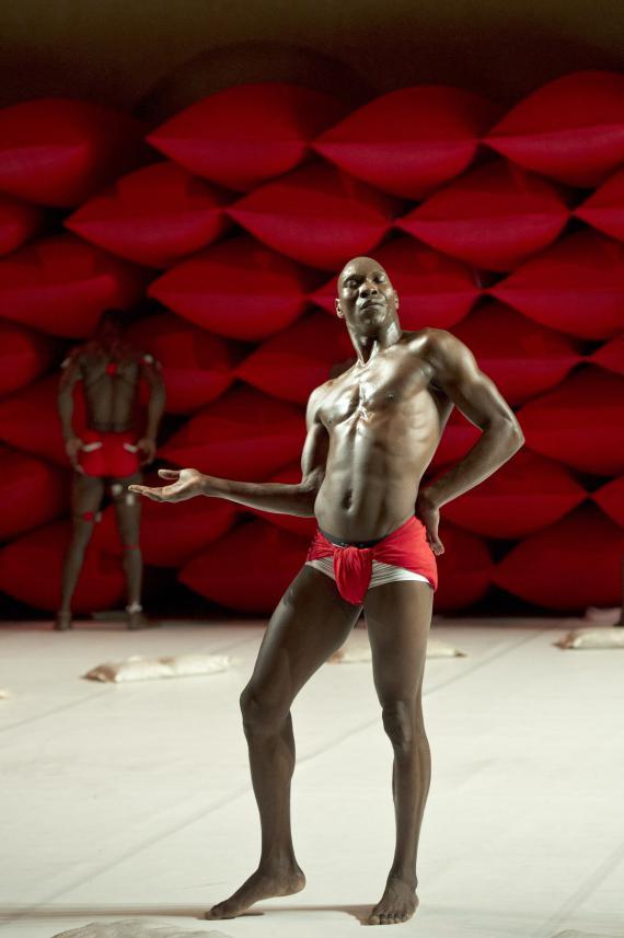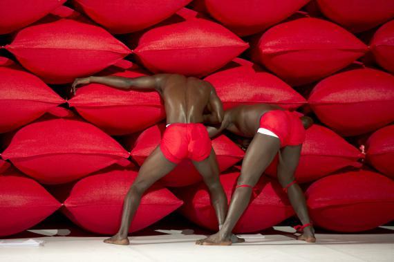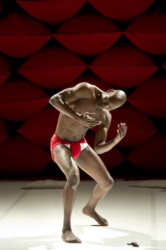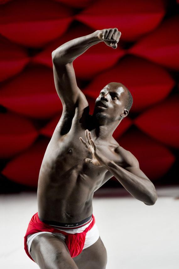 À ceci près que ce n'est donc pas un descendant d'Hergé qui se pique d'étaler cela, mais un chorégraphe burkinabé contemporain, qui se charge dorénavant d'en orchestrer les contradictions. La plus saillante étant qu'il n'esquivera rien de l'évident potentiel d'érotisation que viennent exciter ces corps, noirs d'ébène, ceints d'un simple slip blanc, lui-même sanglé d'un bandeau rouge vif. Ces crudités de couleurs franches au plus près des chairs ont un éclat sanguin.