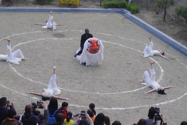 Le point faible du centre est son emplacement en marge de la capitale (à Séoul les temps de transport se comptent en heures), mais surtout les dimensions modestes du seul studio équipé de gradins (pour une jauge d’une petite trentaine de personnes). Pour le festival d’ouverture, le 8 et 9 avril, Choi a tout de même réussi à y faire entrer le double, pour voir Sun-A Lee présenter une nouvelle version de son solo Trollitude et une ébauche d’une nouvelle pièce, B(l)ack and White, accompagnée live par le musicien expérimental Remi Klemensiewicz. Mais on a aussi pu profiter des espaces en extérieur et voir Dickson Mbi maîtriser le lion coréen, entouré d’un beau corps de ballet.