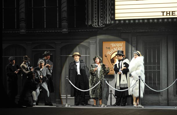 Cette mise en abîme du cinéma regardant sa propre et jeune histoire (ce que l'on appelle le backstage film) est aussi sans concession, pointant la bêtise de certaines vedettes, le star-system et son public fanatique, le poids — déjà — de l'image et de la communication, l'envers souvent gris d'un décor plein de paillettes, l'angoisse de producteurs soucieux de ne pas rater le tournant du parlant... Ce regard finalement très satirique sur le septième art fonctionne mieux dans le film que sur la scène, qui se trouve forcément dans la situation de la citation et de l'hommage au film-culte.