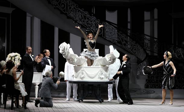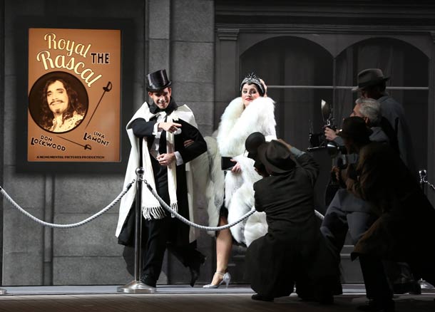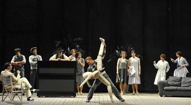 D'autant que l'équipe anglo-canadienne du Châtelet dirigée par Robert Carsen a fait le choix de la fidélité absolue au livret pour cette adaptation scénique. Au point que l'on y retrouve les chansons mais aussi tous les dialogues originaux (surtitrés en français), ce qui est appréciable. Il y a même 40 minutes d'ajouts, puisque la seule première partie fait déjà 1h35 ( ce qui est un chouia trop long) , soit quasiment la durée du film. Mieux vaut, d'ailleurs, ne pas revoir le film avant d'aller au spectacle, car on sera forcément gêné de ne pas retrouver visuellement ce que l'on entend, notamment certaines scènes cultes du film comme la rencontre impromptue avec Kathy dans la voiture (ici, elle se fait devant le cinéma où vient de se dérouler la première du film), le long et mémorable plan-séquence sur la chanson Make 'em Laugh qui devient juste une chorégraphie le temps de la chanson, ou le film multicolore autour de Broadway Melody. Quant à l'après-soirée de première où Kathy, Cosmo et Don se décident à travailler ensemble et chantent le génial Good Morning, il ne se déroule plus dans la cuisine de Kathy, mais devant le cinéma, ce qui ne permet pas de comprendre pourquoi nous sommes déjà au petit matin...