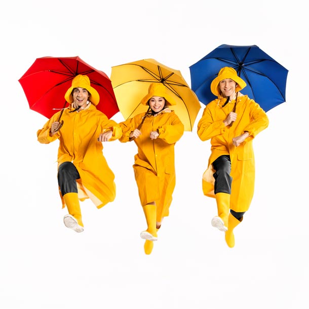 Et maintenant, que dire des courageux artistes et chorégraphe, qui se sont frottés à des images et des mouvements si légendaires ? La chorégraphie de Stephen Mear (qui avait déjà monté une version scénique de Singin à Londres) est diablement efficace et rythmée. Elle est bien souvent épatante, notamment pour Make'em laugh, et pour le trio en claquettes de Cosmo, Don et la coach vocal, l'irrésistible Jennie Dale. Les ensembles du Broadway Melody sont aussi fort bien montés, et les danseurs de belle facture. Mais il y manque toujours une donnée importante que l'on trouvait dans la chorégraphie de Gene Kelly : l'humour et le naturel enfantin et spontané des mouvements pour tous les personnages dansés. L'effet comique est fondamental dans le solo de Make'em laugh , où Cosmo, dans le film, ne cesse de tomber à terre, et il manque ici singulièrement, même si le résultat est déjà formidable. L'humour et la naïveté de l'enfant sont très importants aussi dans la chanson titre, où Don-Kelly s'éclabousse et danse dans les flaques d'eau comme un gosse, là ou Stephen Mear donne à voir au Châtelet un Don avant tout romantique et amoureux. On retrouve pour autant la drôlerie dans la scène du générique, où tout le monde chante et danse Singin' in the rain en... bottes et ciré jaunes, et parapluie multicolore du meilleur effet.