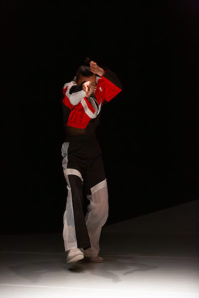 Ce solo porte les traces d’un long périple. Hong-Kong puis la Thaïlande. Elle s’est immergée dans les arts martiaux, notamment le Tai-chi. À Bangkok, elle a rencontré Pichet Klunchun, célèbre danseur traditionnel de Khon qui a été le sujet d’un « Portrait » de Jérôme Bel (Pichet Klunchun and Myself) en 2005. Ce voyage en Asie a nourri cette création, non pour en reproduire les formes, mais pour en comprendre la mécanique intime : comment une force se détourne, comment une impulsion devient direction, comment une émotion peut se transformer en souffle plutôt qu’en débordement. Car la colère en est son moteur. Ici, jamais un éclat, mais matière à déplacer, à canaliser, à rendre vivable. Dans cette tension, Gruwez se découpe avec une netteté presque graphique. Ses vêtements géométriques — noir, rouge, blanc — affûtent la silhouette. D’abord imaginée comme motarde ou skieuse, elle évoque des figures de mangas, des esprits japonais, des guerrières stylisées, grâce à sa gestuelle, angulaire, segmentée qui peut faire songer à un kabuki au féminin. Mais rien n’est illustratif : ce sont des résonances, des échos, des manières de rendre visible une énergie qui cherche son axe. Mais c’est surtout du Lisbeth Gruwez avec son mouvement souple et saccadé, fragmenté et hyperconnecté, sa précision redoutable, ses arrêts impeccables et tout un travail des mains, jointes, ou dessinant l’espace avec un tranchant implacable. Bien sûr, cela rappelle l’exactitude des Katas, ces enchaînements inhérents aux Arts martiaux. Mais, (et surtout si l’on s’est abstenu de lire le programme) surgit aussi des réminiscences du Constructivisme russe, de Kazimir Malevitch à Alexandre Rodtchenko ou Naum Gabo, en passant par les Ballets suédois de Jean Börlin. Bref, un petit air des années 1920, avec leur goût pour le machinique et les angles droits.