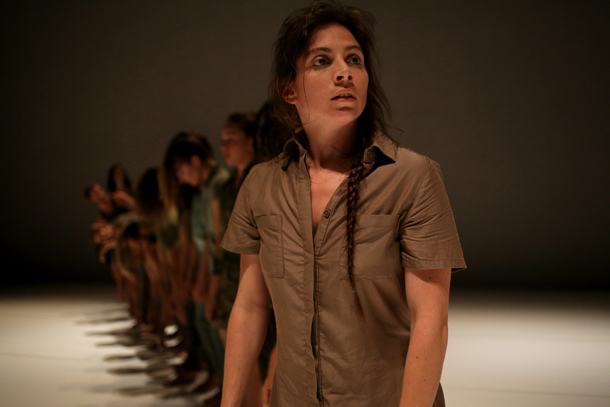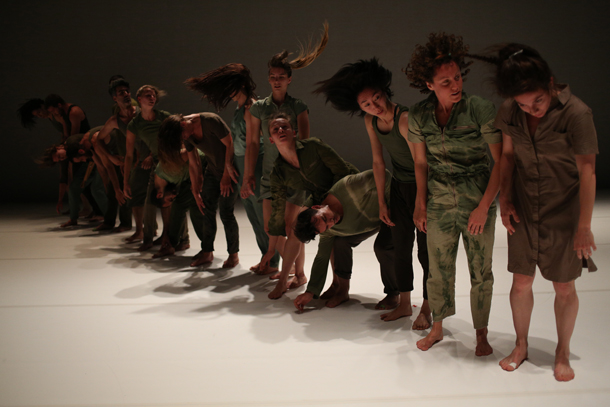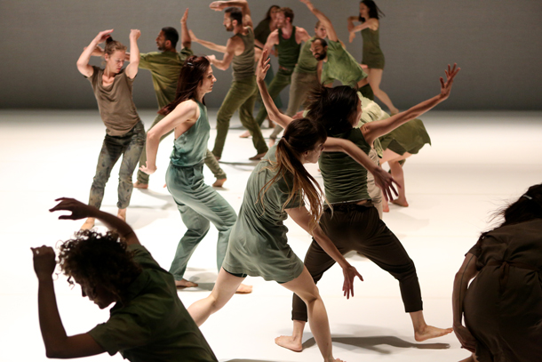 À présent Tenir le temps est, elle aussi, une pièce de grand effectif (seize danseurs.ses sur le plateau). Mais ce sont tous de jeunes professionnels de très bon niveau technique, engagés sur audition. Et leur déploiement n'a d'autre sens que de faire jouer les puissances de la grande composition chorégraphique.